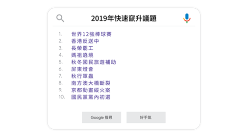 根據 Google 彙整統計,台灣 2019 年快速竄升議題關鍵字中,世界 12 強棒球賽登上搜尋第一名;香港反送中事件牽涉人權議題與社會運動,不僅在國際上備受關切,在台灣也引發熱議,位列第二名;長達 17 天的長榮罷工,引起社會對於航空業勞資雙方權益的激烈討論,分別登上快速竄升議題第三名及年度關鍵字總榜第六名。