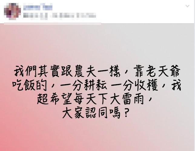 由於外送平台近年來超夯,投入外送員數量激增狀況下,訂單時常被分光,排班也有排不到的狀況發生,就有外送員在「 UberEats 台灣」貼文指出「我們其實跟農夫一樣,靠老天爺吃飯的,一分耕耘一分收穫,我超希望每天都下大雷雨,大家認同嗎?」