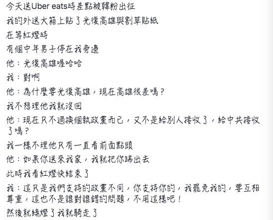 原 PO 在「公民割草行動」指出,今天送 Ubereats 時差點被韓粉出征,因為我的外送大箱上面貼著「光復高雄」與割草的貼紙,等紅燈時有個中年男子走到我旁邊說「光復高雄喔哈哈!為什麼要光復高雄?現在很差嗎?」而我不想理他就沒回。
