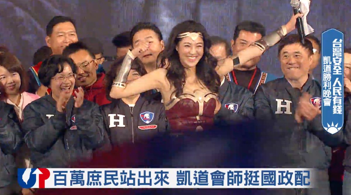 國民黨總統候選人韓國瑜選前倒數兩天在凱達格蘭大道舉辦百萬人造勢大會,現場除了15位藍營縣市首長全到齊,立委許淑華更再次穿上「韓粉」熟悉的戰袍,扮演神力女超人現身,讓現場數十萬支持者情緒沸騰。