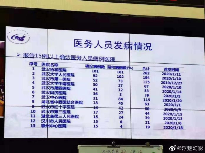 中國武漢肺炎不僅在全球延燒,其境內含港澳地區總共確診 2 萬 4424 起個案,死亡人數達 493 人,繼重災區武漢市先於 1 月23日宣布「封城」後,截至目前為止,中國已經有 35 座城市宣布進行社區封閉式管理。而近日,就有一張圖片在網上瘋傳,內容為武漢醫務人員感染肺炎數目,引發熱議。