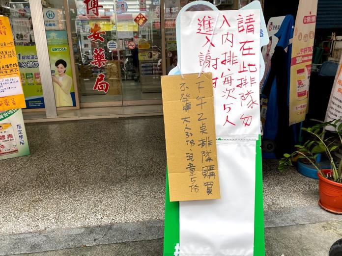 除了這家藥局,另外一家位在宜蘭市民族路的藥局,因為只有一位藥師服務,加上內部空間不大,所以就在門口掛起「請在此排隊勿入內,每次5人進入」的牌子。口罩轉移至健保特約藥局出售,藥局只好各自想辦法應付突如其來的額外業務。