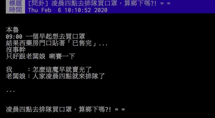 原 PO 在 PTT 發文指出,自己早上九點想說去買個口罩,結果西藥房門口卻貼著已售完的公告,沒事就問一下老闆娘「怎麼這麼早就賣光了?」老闆娘則說「人家凌晨四點就來排隊了」這讓原 PO 震驚地的說「這裡是新竹市區,凌晨四點排隊買口罩,算鄉下嗎?」