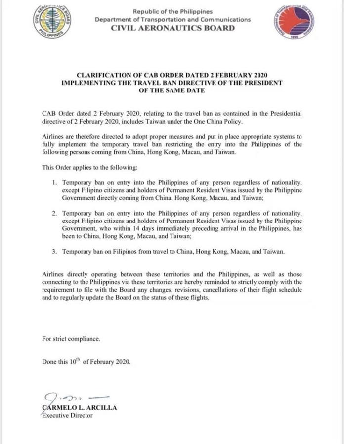 菲律賓民航局2月 10 日發出聲明,暫停「所有來自中港澳台及 14 天內有中港澳台旅遊史的外籍旅客入境」,同時也暫停菲律賓公民前往中港澳台。聲明內容明確指出,菲律賓總統杜特蒂2月 2 日為了抗疫採行的旅行禁令,其依據為「一中原則」,故台灣也在適用範圍內,航空公司應據此採取適當措施,比照中港澳處理