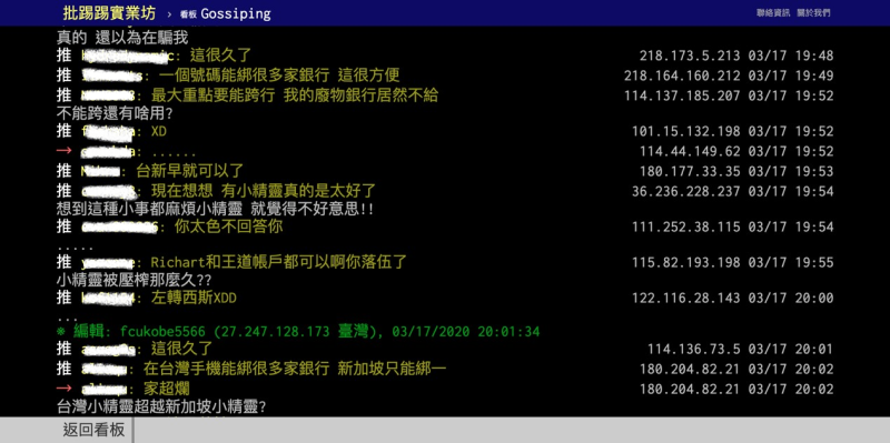 然而,日前還是有網友不清楚這樣的服務,在PTT上發文詢問「輸手機號碼就能轉帳?是小精靈在幫忙嗎?」就有網友回覆「2016年就能了,去設定就好」「手機號碼設定成轉帳帳戶很方便」「這給常要給帳戶的人很方便、記手機就好了」「真.手機轉帳」,也有網友分享國外經驗「在台灣手機號碼能綁很多家銀行,新加坡只能綁一家超爛」。