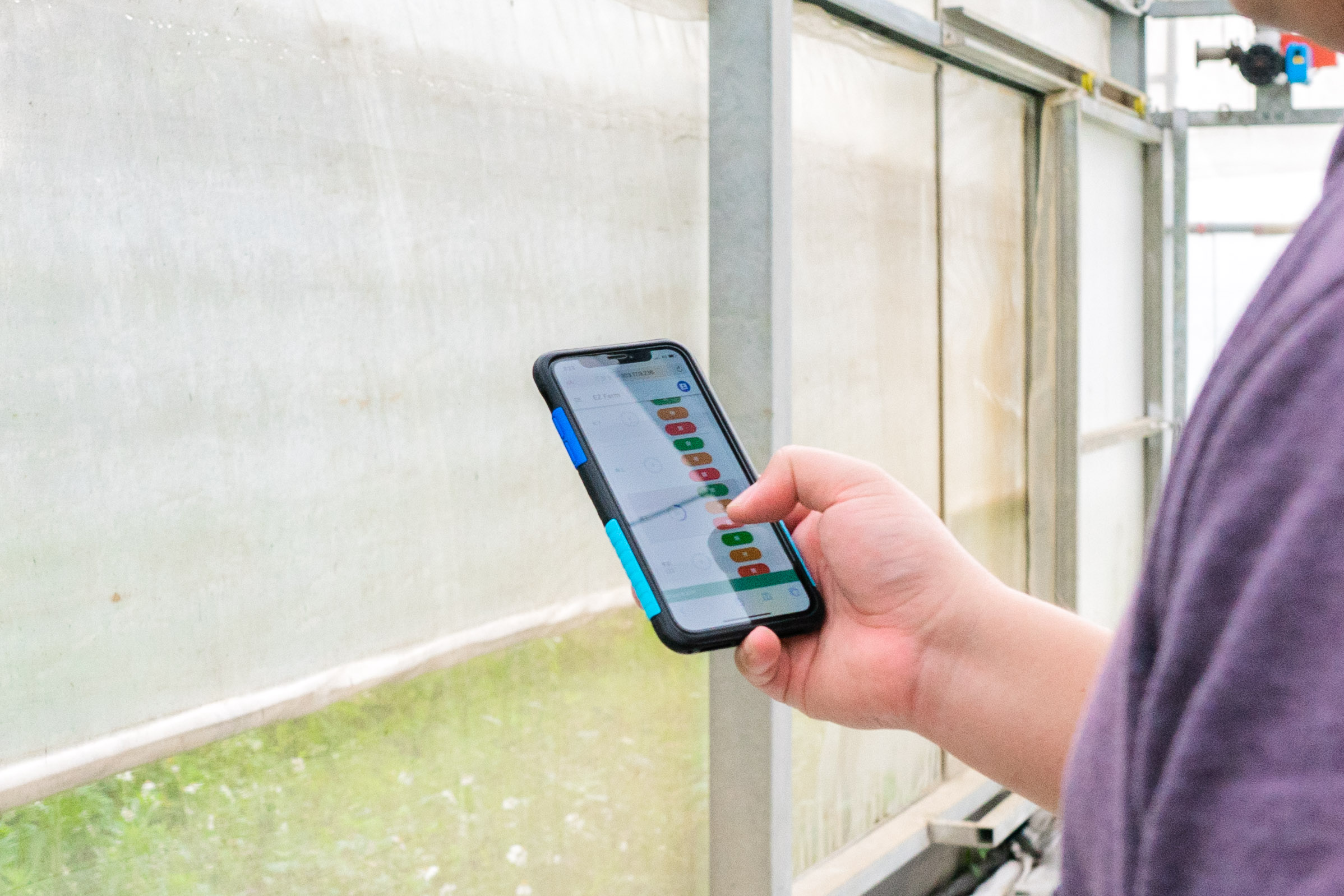 「草菓農場」共同創辦人馮智敏使用手機系統控制溫室內外的遮陽簾升降。 (圖/攝影 林琮恩)