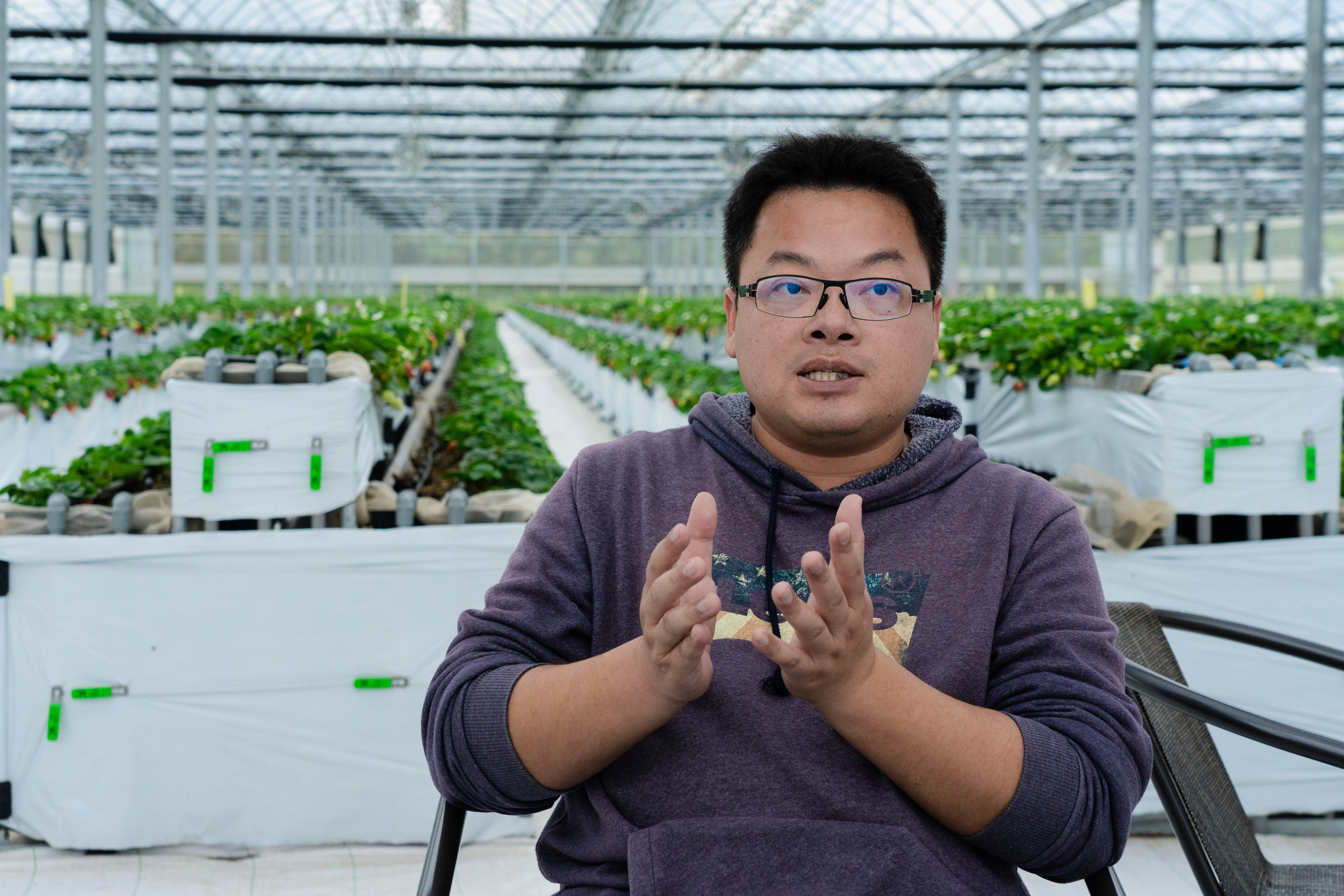 國立交通大學機械工程學系博士學位背景的馮智敏,三年前與好友一手投入科技農業,期待以有別於傳統農業方式,打造無毒草莓。 (圖/攝影 林琮恩) 馮智敏認為,現今不少農民因對數據、資料等領域感到陌生,而對數位轉型抱持觀望態度。「很多人都講AI ,但要解讀不容易,必須同時會看大數據,還要懂農業。」他以自身為例解釋道,若農民已先對科技、資訊有涉獵,再親身接觸農業實務,或許能讓數位科技與農業的結合達到較理想的狀態,「否則農民取得資訊之後,他不知道數據可以做什麼。」他也指出現今農業教育的問題,「像是農學院或農藝系背景的人,他們的專長就只有農業,所以跨不出來。」