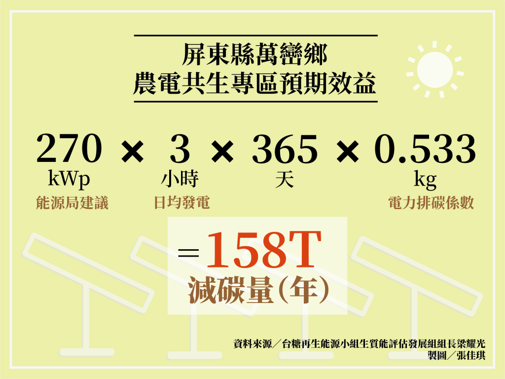 森林有蘊養環境的作用,但綠能也有減碳的功能。負責營農型光電計畫前期規劃的力暘能源股份有限公司副總經理袁淑湄認為,經濟林的土地用途本為農地,營農型光電計畫只是將該地回歸農用,並發展綠能經濟。且營農型光電計畫依規定農作物產值需達國家平均產量70%,大面積的栽種也許能開展萬巒鄉新農業模式,創造工作機會,同時提升農業產值和糧食自給率。