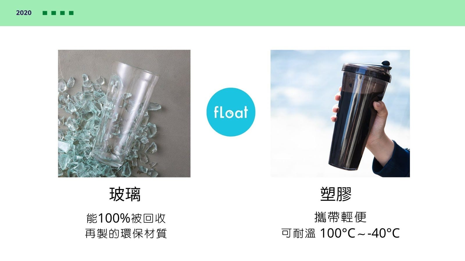 FLOAT創辦人吳天瑜和史芳就讀於實踐大學時,因先前有做過環保作品的經驗,而選擇用玻璃當成循環經濟的展題,開始發想畢展作品。市面上已有許多環保飲料杯的相關產品,FLOAT團隊在開發前,大量訪談過環保產品的使用者,並歸納出市面產品的共通點,結果為「環保吸管不易清洗、不易攜帶收納」,因此吳天瑜和史芳以「如何不用吸管也能喝到珍奶」這個想法為出發點,經過討論提案後,最終採「活動式凹槽內杯」為他們的設計核心,將飲料與配料分開,配料裝於內杯,並承載在杯口上方,能不用吸管就可以喝到配料。