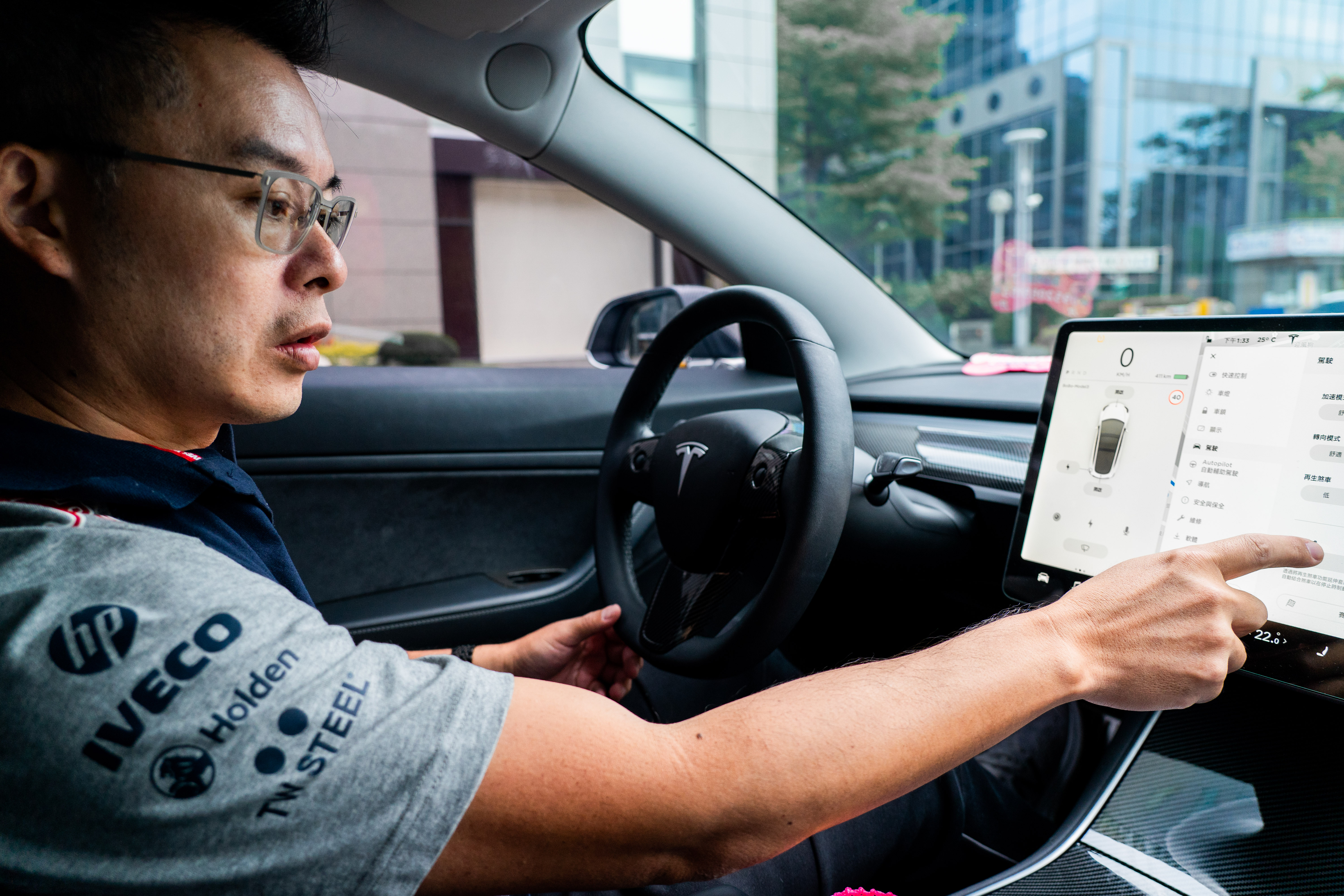 專業試車手Andy老爹駕駛特斯拉Model 3純電汽車上路,帶記者體驗純電汽車實際行駛的情形,圖為Andy老爹正透過中央控制面板調整駕駛設定。(圖/攝影 林琮恩) 產官合作成效不佳 政府盼企業挹注資金