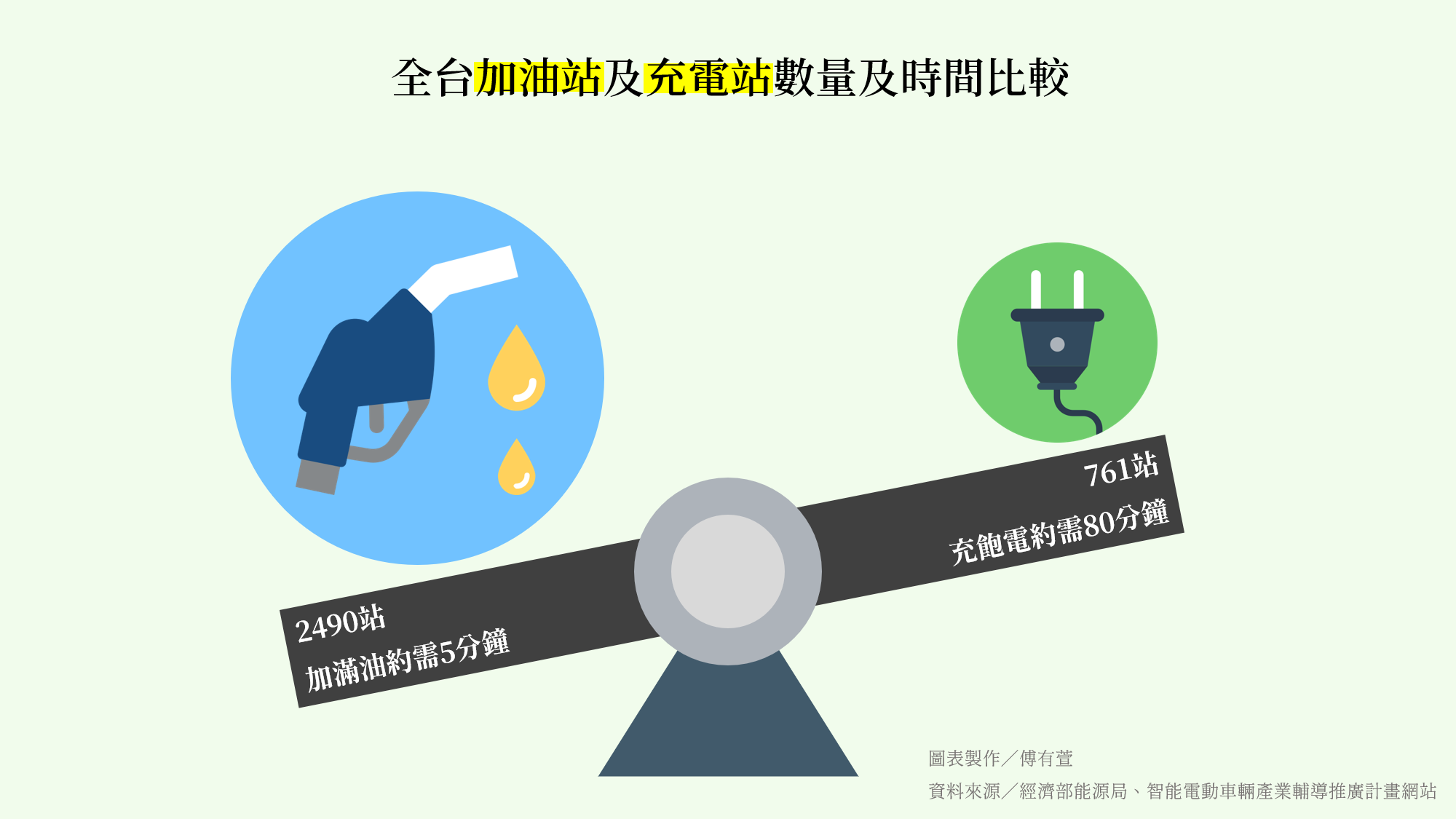 公有的充電樁主要分為一般充電站與超級充電站,一般充電樁所需的充電時間約數小時,超級充電樁則能縮短到幾十分鐘。打開純電汽車車主常用的充電站查詢App,只見國內的充電站站點分布,仍以大台北地區及台中等六都之市中心為主。超級充電樁主要由特斯拉品牌提供,根據其官網公告,台灣至今已啟用17個超級充電站,平均267位特斯拉汽車駕駛須共同使用一個超級充電站。Andy老爹指出,對消費者而言,純電汽車充電樁數量不足相當程度削弱他們的購買意願,「如果消費者連充電都要排隊,那他們理所當然會想:買能加油的車不是比較方便嗎?」