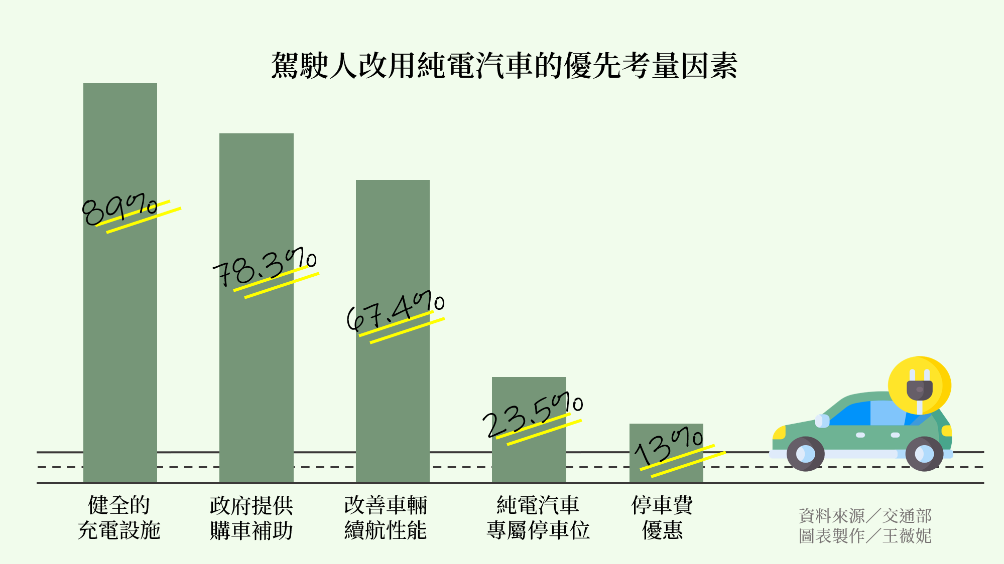 從交通部的調查報告中可窺知,駕駛人購置純電汽車時的優先考量因素中,有89%選擇「健全的充電設施」,可見充電設施在純電汽車的推廣上至關重要。身為特斯拉 Model 3 車主的專業試車手Andy老爹表示,車主駕駛純電汽車時最大的擔憂來自「里程焦慮」——上路時需要時時擔心剩餘電力是否足夠完成旅程。