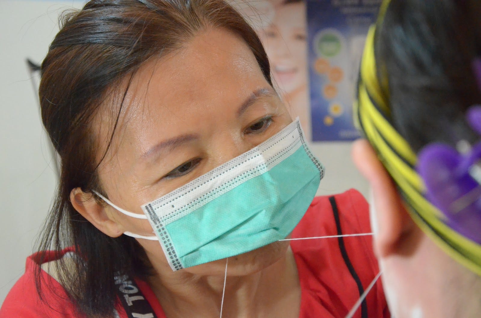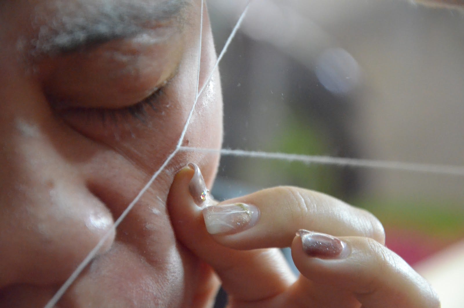 鄭桂子嫻熟的使用傳統式挽面。 (圖/攝影 林襄琦) 對於傳統式與新式挽面的差別鄭桂子說:「就像拔草一樣,新式就像是用鐮刀把草割斷,但我們是連根拔起。」除此之外她表示,新式挽面大多都只是大面積的將較粗的雜毛拔掉,但是傳統式挽面則是能夠將臉上的細毛拔除並且還有按摩皮膚和清除角質層和粉刺的作用。