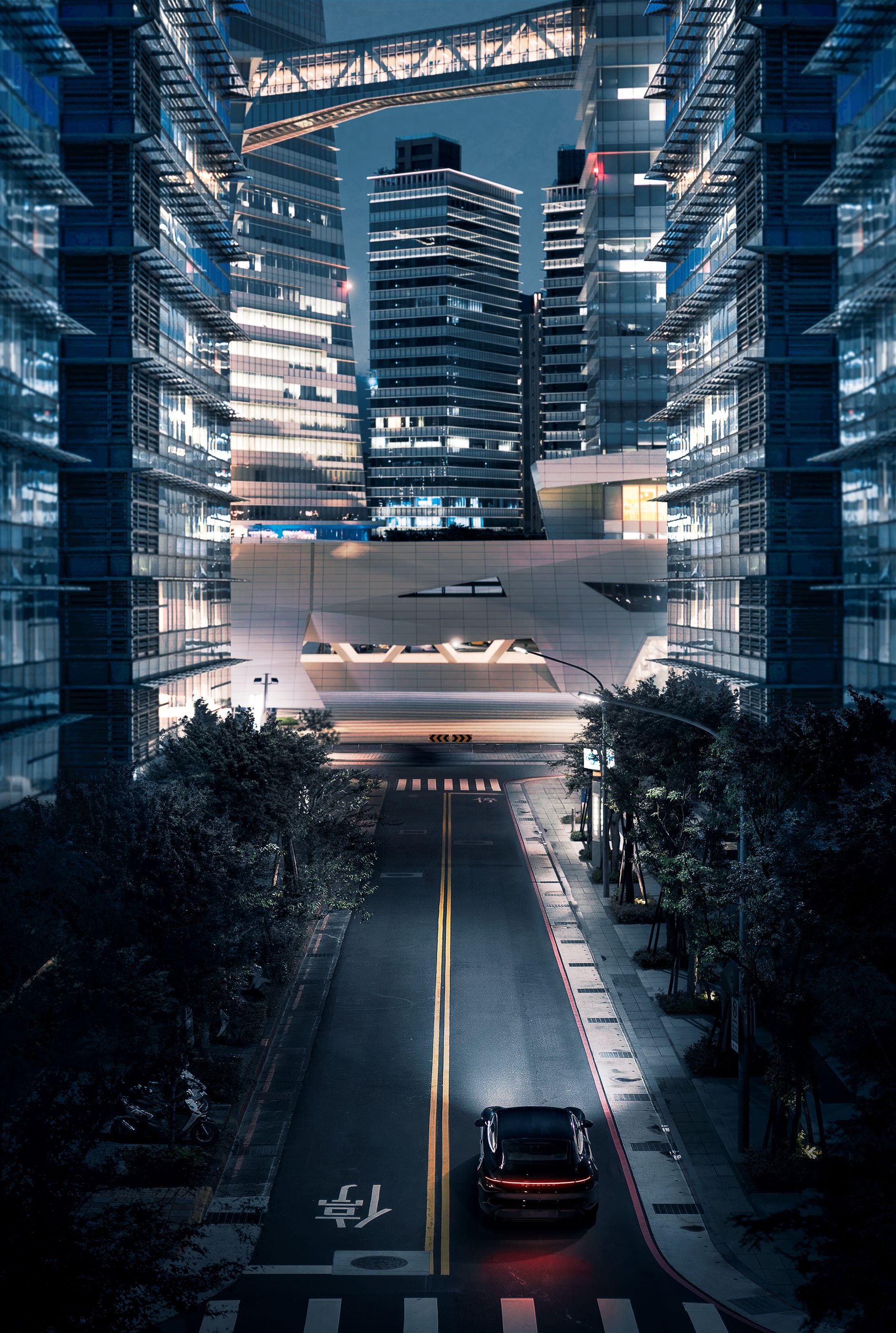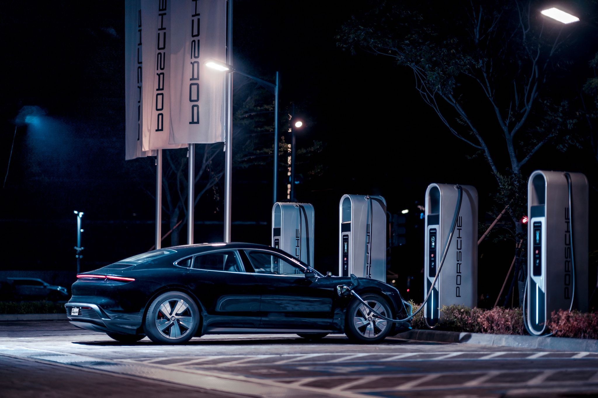 Porscche Taycan 揉合保時捷純正跑車靈魂與劃時代純電動能科技,結合不容錯認的車身線條,化身一股寂靜的電光石火,奔流於台北都會街頭。
