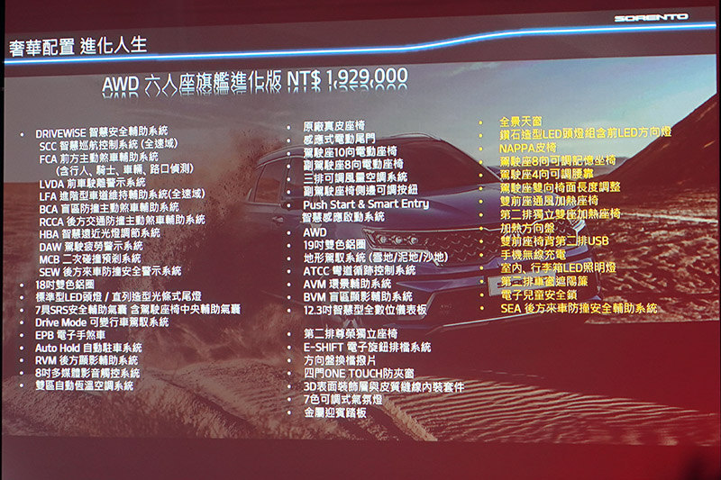 除了在All-new Sorento預售階段公布的5個車型規格外,Kia總代理森那美起亞汽車為提供國內車主最頂級的尊榮享受,在11日正式上市時,特別驚喜推出All-new Sorento旗艦進化型,以更豪華的頂級配辦,滿足層峰車主的引頸期盼。All-new Sorento旗艦進化型,除了在外觀上升等鑽石造型LED頭燈,內裝更升級搭載全景式天窗,並享有過去多僅見於豪華車款的NAPPA透氣真皮座椅。同時,為提供駕駛更個人化的座駕設定,All-new Sorento旗艦進化型更升級搭載駕駛記憶座椅、HUD投射式駕駛資訊抬頭顯示器,與金屬油門煞車踏板。其他豪華配備,包含雙前座通風加熱座椅,第二排獨立雙座加熱座椅、前座無線充電、雙前座椅背第二排USB、及第二排車窗遮陽簾等,也都是All-new Sorento旗艦進化型專屬。此外,在安全配備上,ROA後座乘客警示系統,以及同級唯一(註1)的SEA後方來車防撞安全輔助系統,也讓All-new Sorento的安全防護更上一層,讓層峰車主為家人打造更堅實舒適的移動城堡。