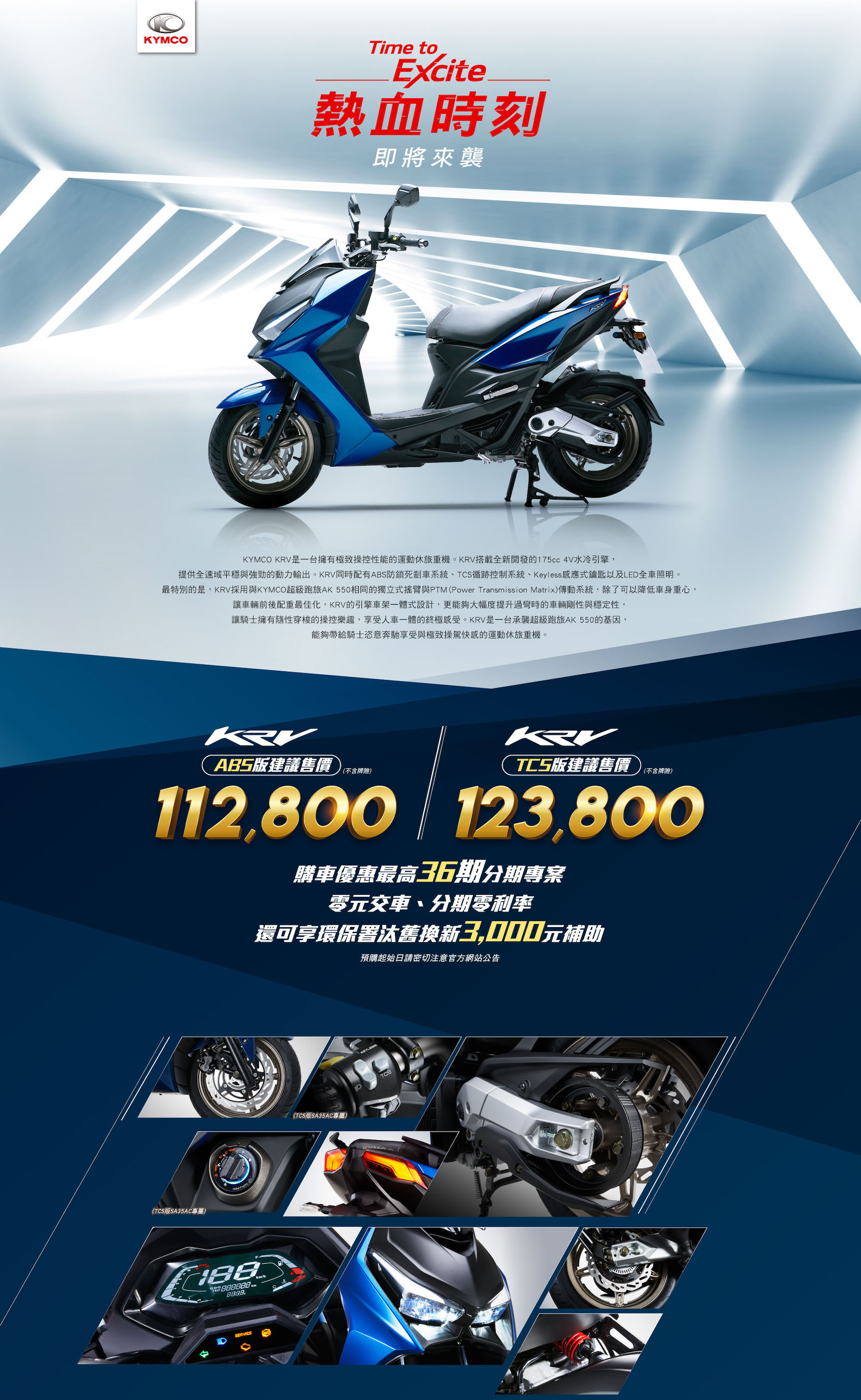 Kymco 正式宣佈 KRV 售價,KRV ABS 版為 112,800 元、KRV TCS 版為 123,800 元,上述價格不含牌險。特別的是,KRV 是七期環保車款,消費者還可享環保署汰舊換新 3,000 元補助,購車優惠最高 36 期分期、零元交車、分期零利率。