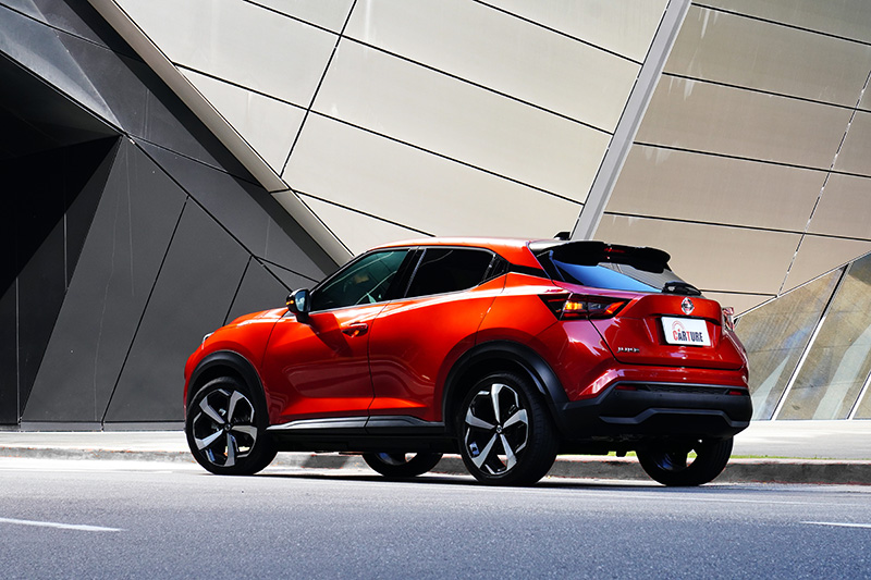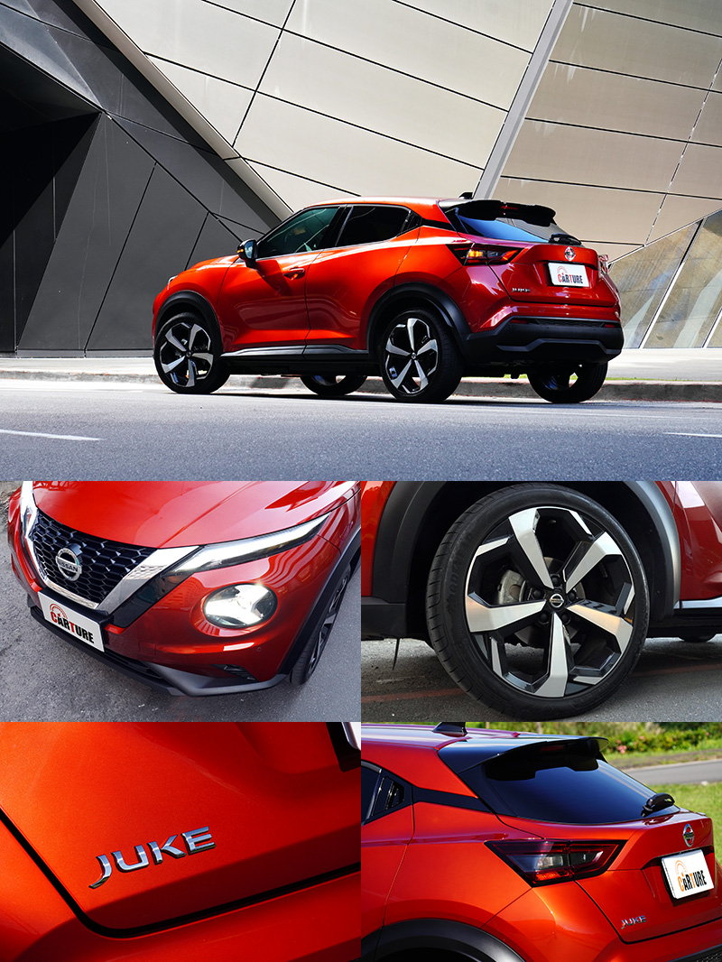全新引進的Juke,在外型輪廓上大致與前代相彷,還是以跑車加上SUV的概念去設計,但藉由線條與車頭與車尾造型的改變,讓整輛車變得順眼許多,不再有前一代的強烈突兀感,車頭部分家族語彙V-motion 2.0水箱護罩,搭配最具特色的分離式頭燈組,上緣飛翼狀LED日行燈與水箱護罩兩側相連,圓形頭燈組則被保留,但燈內Y字形LED排列則是全新特色,車側則保持原來的大曲度鈑件線條,不僅肌肉感足,也讓光影層次更為分明,最後來搭配19吋大尺碼輪圈,都讓它霸氣外顯,整輛車唯一相對不那麼搶眼,比較中規中矩的大概就是車尾設計了,但搭配協調感還是很好,也是讓Juke讓更多人可以接受的主因之一;面對新Juke,原本喜歡它的人,覺得它仍舊有自己的特色,原本不喜歡的人變得可以接受許多,而這樣的討喜程度也反應在銷售上,新Juke在上市前就已展開預售,接著上市至今不到一個月,首批300輛已經快被訂完,以一款風格如此強烈的新車,以及強敵環伺下,能有此表現可說相當不容易。