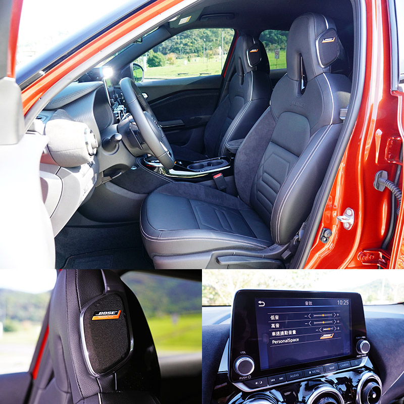 而在本次試駕的頂規「駕趣享樂版」上的另一個焦點是,搭載同級唯一的BOSE® PERSONAL® PLUS環繞音響系統,除了配置在傳統A柱下方與前車門板下緣的喇叭外,最特別的就是在雙前座座椅的頭枕兩側各設了兩組、共四支喇叭,這組平行於耳朵邊的喇叭,聽起來效果很像將耳機掛在耳後,使音樂迴盪在耳邊,達到環繞效果,有種前所未有過的聆聽效果,要說聽起來厲不厲害,只能說我還不夠專業,分得這樣的音場效果是好或是壞,但真的很特別就是了。