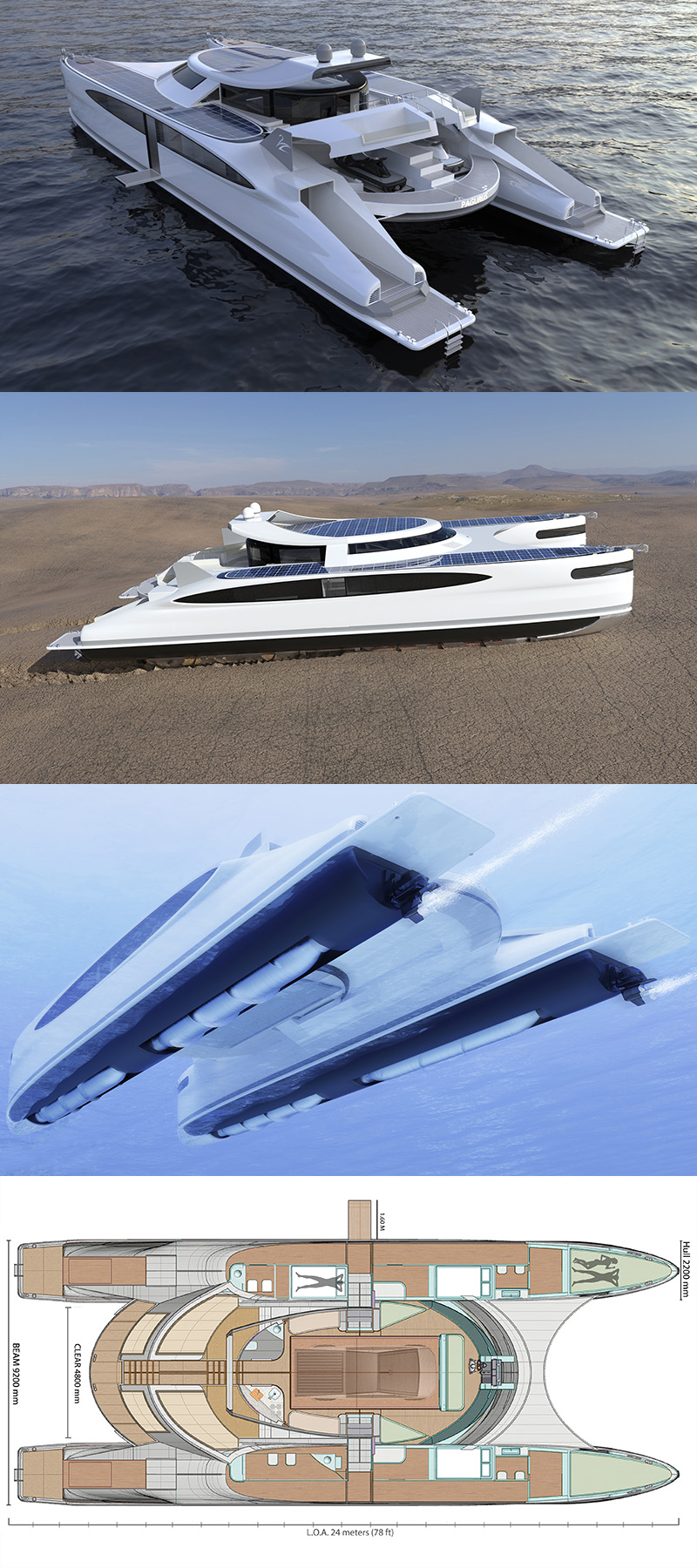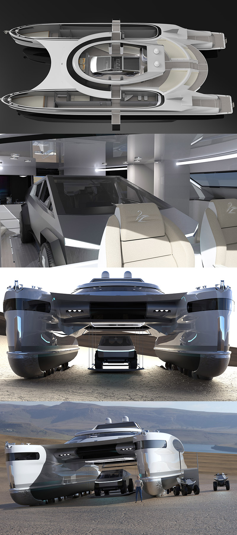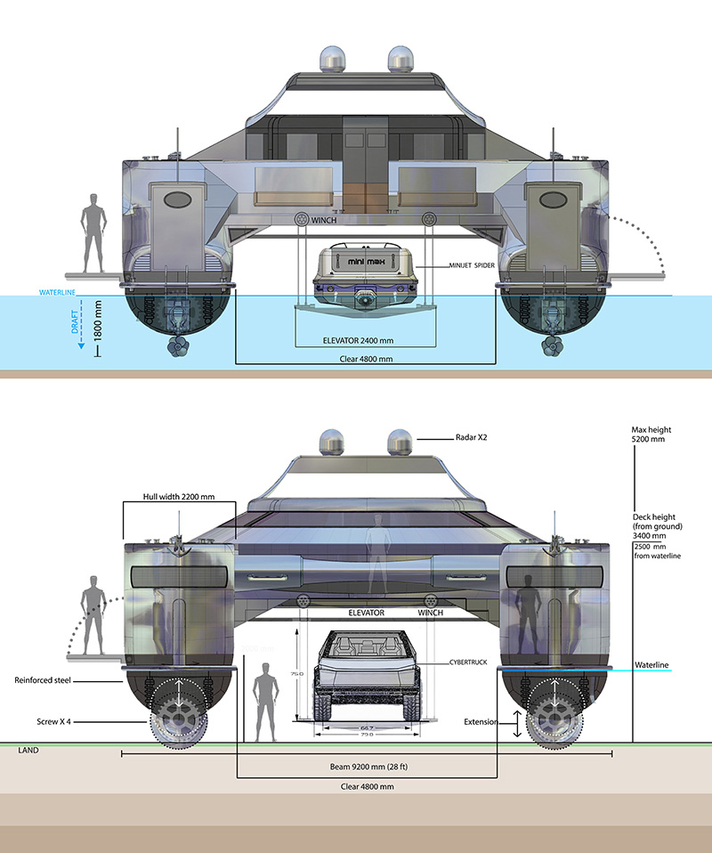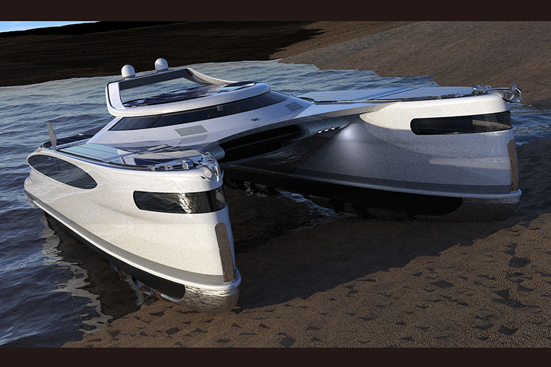 著名義大利設計工作室Lazzarini涉足交通工具與建築設計享譽國際,在此之前推出許多極具創新的作品;每回看到F1摩納哥站或是許多濱海度假勝地,都可以看見許多遊艇在岸邊悠遊的景況,但如過能夠將遊艇直接開上沙灘,甚至從船上在開輛車出來直接可以在陸地上奔馳該有多好,Lazzarini這回以軍用雙船體運輸船為發想,設計了一艘長82英尺〈約25公尺〉、具備八人座客艙、升降車梯、船底可衍伸螺旋驅動體的水陸兩用遊艇。