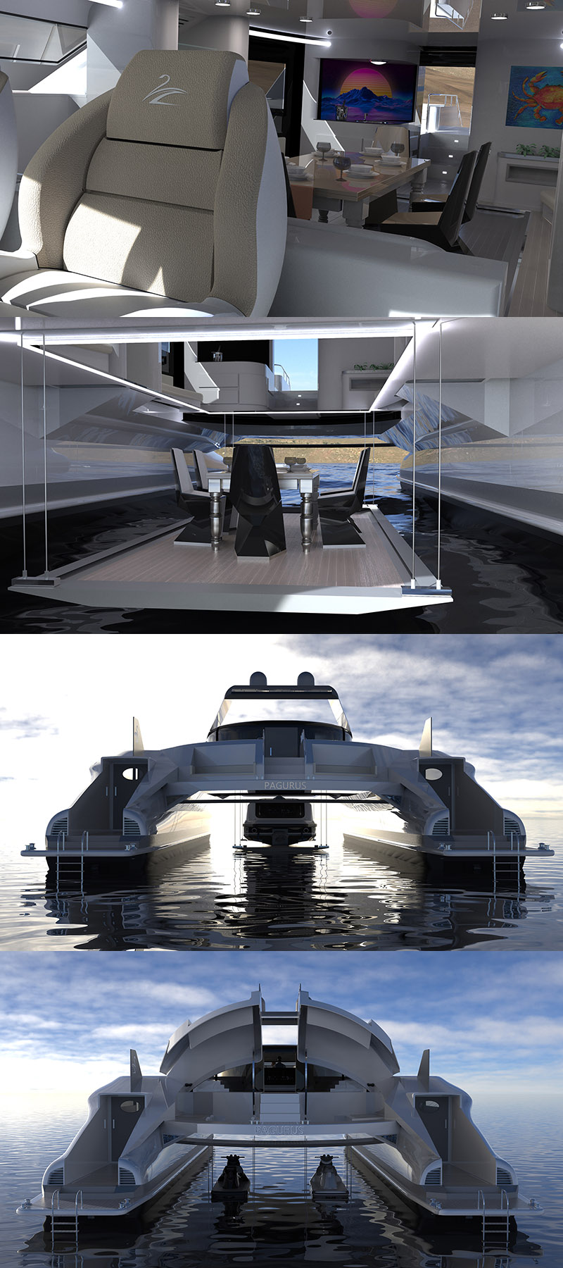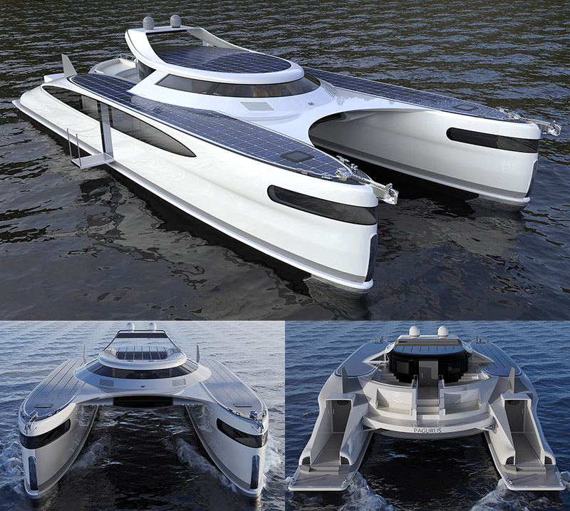 Lazzarini所設計之以拉丁語螃蟹「Pagurus」為名的水陸兩用遊艇,就是希望它可以像螃蟹般,直接自海上游著游著就走上岸,但以外觀來看「Pagurus」比許多雙船體遊艇前衛許多,並在船頂設置了許多太陽能板用來收集船隻所需用電,以及同樣也具有豪華客廳、臥鋪、大面積的景觀窗等遊艇必備設置;但玄機就在雙船體下方,設置有四組各21英尺〈約6公尺〉的螺旋驅動體,可在遊艇接近沙灘時,往下衍伸而出,並各由一具可輸出440hp的引擎驅動,讓遊艇可以直接開上沙灘,最特別的是在中央船體中還設計了一組升降梯,可將Tesla的皮卡Cybertruck、兩輛沙灘車等車輛,以及水上摩托車或小艇直接升上船艙中,或自船艙中降下至地面或海面,讓船主可以延伸玩樂旅途。