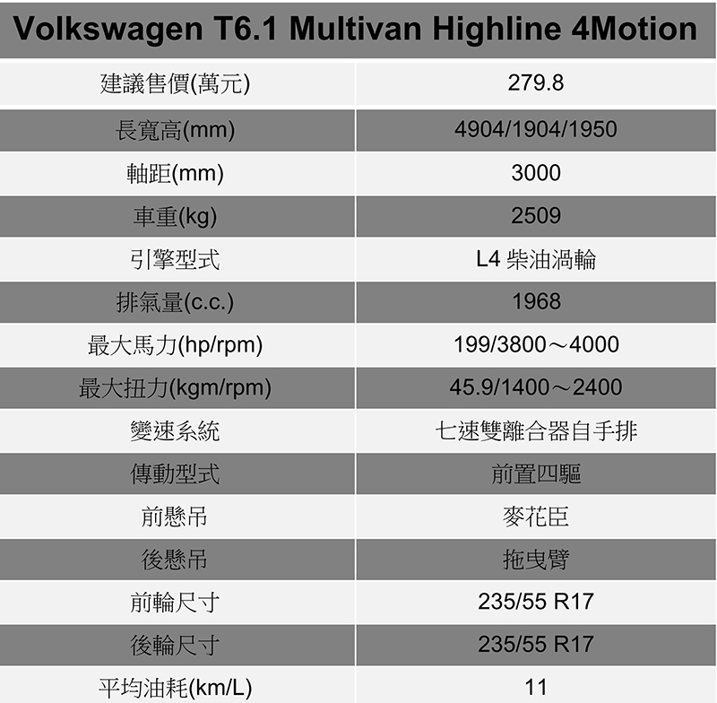 DCC與側風穩定系統讓T6.1 Multivan有著穩定的動態表現。 與以往相比T6.1 Multivan在外觀造型變得更為精緻成熟,內裝多媒體影音配備與智慧駕駛輔助科技也相當齊全,後座機能豐富多變又有寬敞的空間,整體雖然仍給人商務印象,但只要體驗過就會發現其實更適用於多名成員的家庭用車。