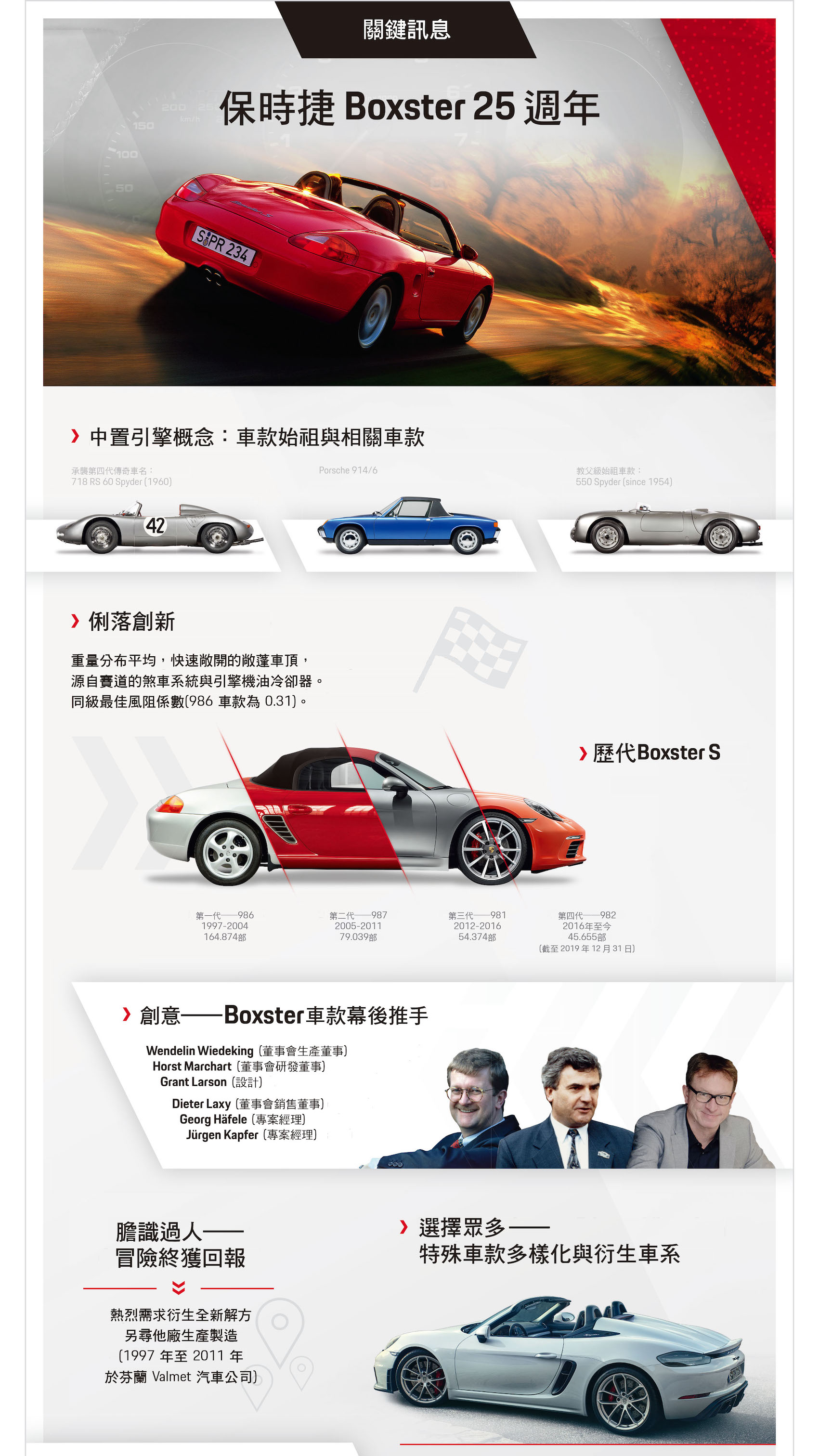 1993年「Boxster」概念跑車設計團隊:車體造型設計師 Grant Larson、車型設計師 Jörg Kirschbaum、設計工作室工程師Otto Geffert、色彩與配備負責人Dorothea Müller-Goodwin、設計部總監Harm Lagaay、建構工程師 Klaus Ziegler、內裝設計師 Stefan Stark、建模師 Peter Müller(自左至右)。