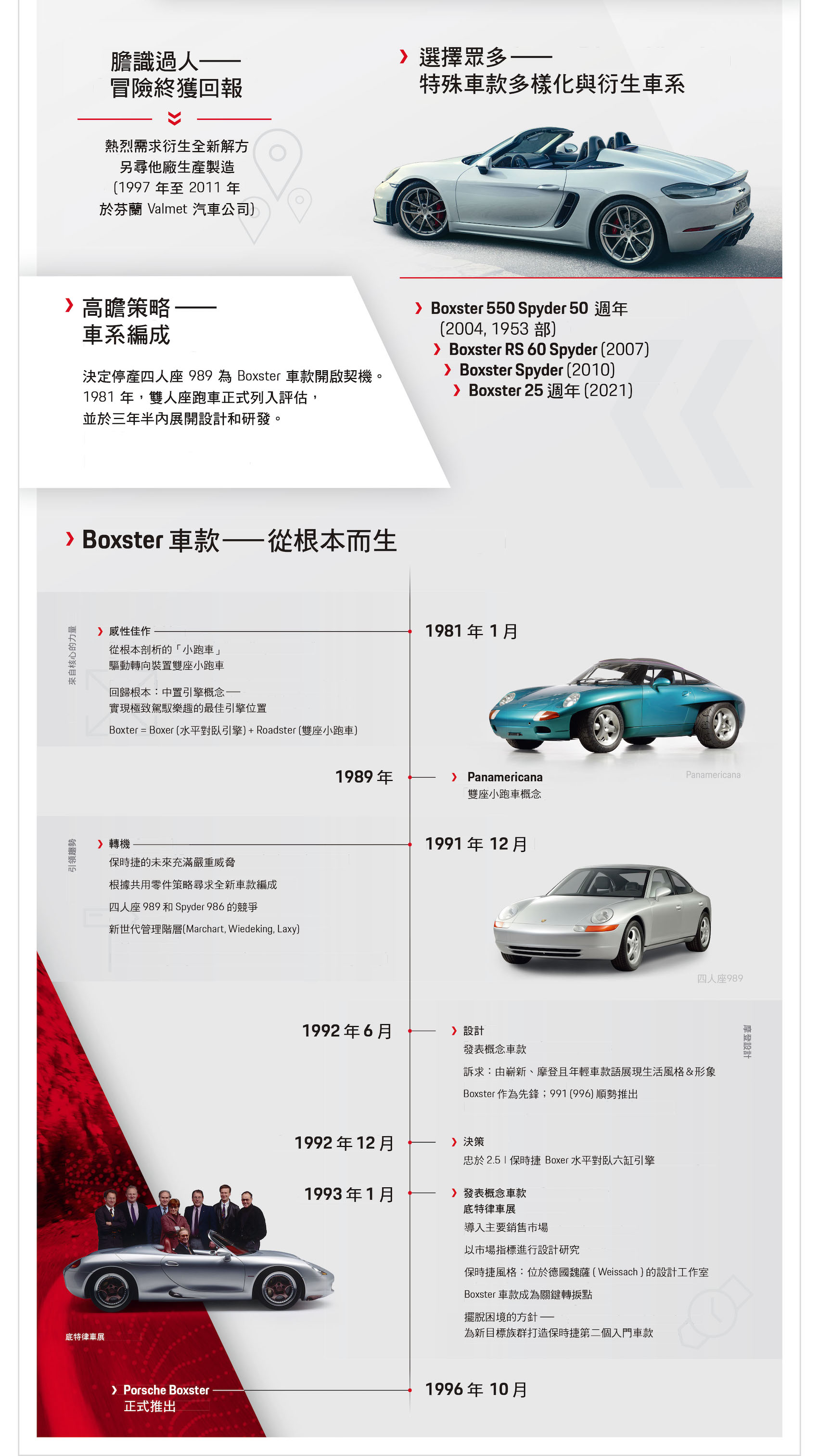 1993 年,保時捷 Boxster 迎來首次同時也是規模最大的考驗:在底特律車展正式向世人發表 Boxster 概念車。保時捷結合水平對臥引擎「boxer」第一音節和雙座小跑車「roadster」第二音節所命名的「Boxster」概念跑車,承襲了保時捷自 1948 年發表 356 及 1963 年成功發表 911 以來,一貫卓越而優異的性能和技術特性。