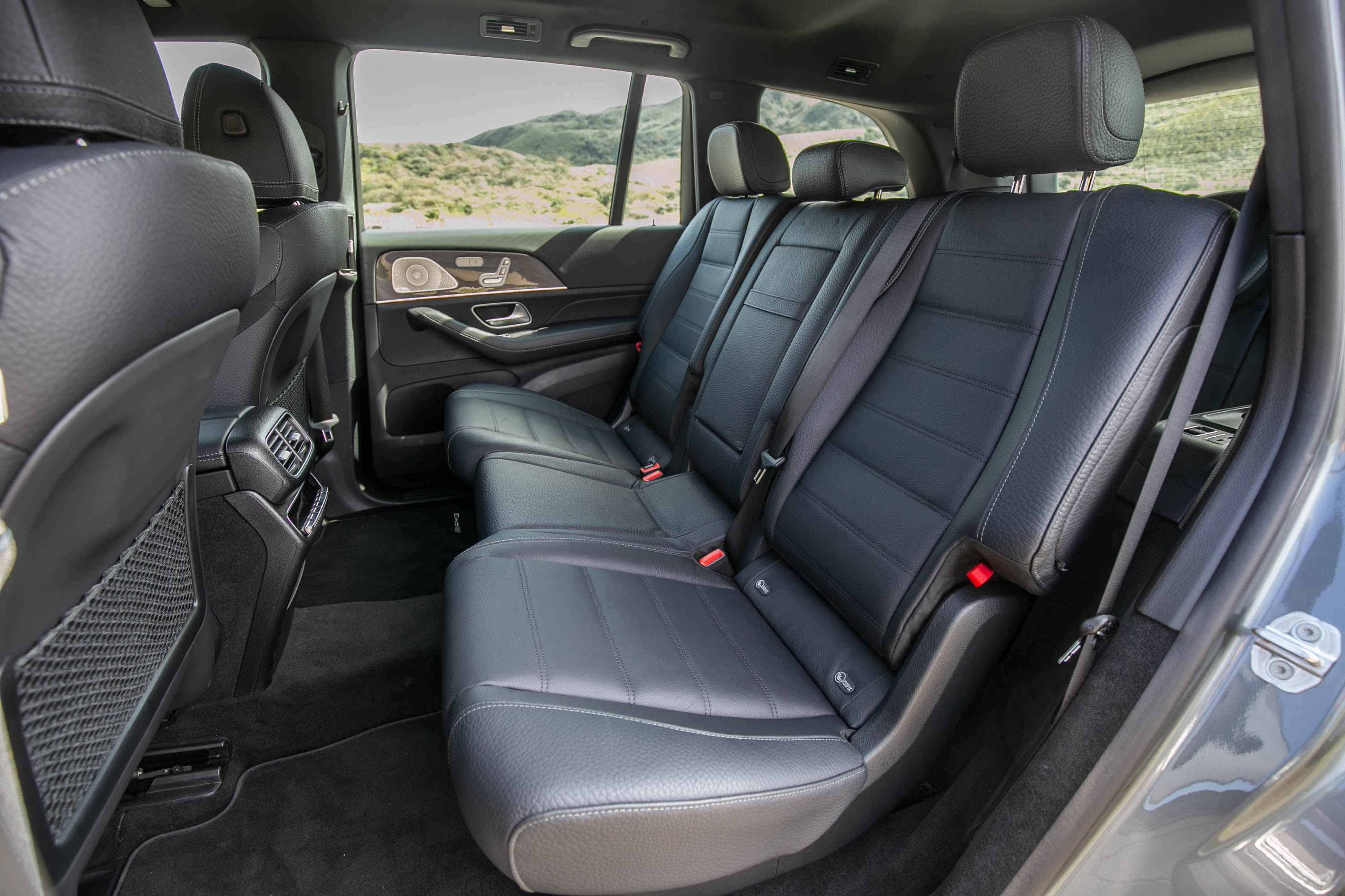 第二排與第三排上方還有額外的空調出風口。 當然,除了科技以外,空間格局同樣是諸多人審視一個「家」良窳的關鍵,以筆者 170cm 身高調整第一排駕駛位置,第二排乘客身高 188cm,第三排乘客身高 166cm,就如圖所顯示的般,三排同時坐著成人是絕對沒有問題的,但對於第三排乘客而言,腿部空間較顯侷促,若要長途乘坐,可能會是個挑戰。這一點一如開場所述,若真的考慮三排乘客都可以輕鬆乘坐,MPV 車型還是最好的選擇,這一點放諸同級對手皆然,不僅有 GLS 450 4Matic 面臨如此問題。