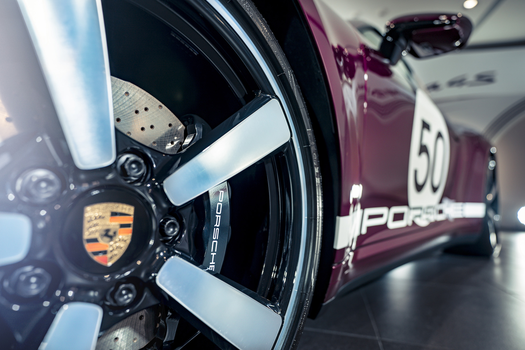 而 911 Targa 4S Heritage Design Edition 除了出色性能外更在各處細節上精雕細琢,展現出保時捷車主不凡品味和風格,車色提供專屬的金屬櫻桃紅(Cherry Metallic)與其他四款車色,搭配金色盾徽展現強烈的 1950 年代復古風格;911 Targa 4S Heritage Design Edition 復古白色塗裝車頭前翼施以箭形圖案賽車元素特別引人注目,更突顯保時捷精彩的賽道歷史;後引擎蓋格柵飾以 Porsche Heritage 徽飾,造型設計類似當年 Porsche 356 達成 100,000 公里行駛紀錄所獲之獎章;當時獎章被視為優異品質保障,融合現代化視覺元素,將綴飾於 Porsche Heritage Design 車款的車尾。1963 復古盾徽分別鑲嵌於前行李廂蓋、方向盤、輪圈蓋與鑰匙,頭枕與鑰匙套也壓印經典的復古盾徽,輔以標準配備的前 20 吋、後 21 吋 Carrera Exclusive Design 輪圈與經典款式黑色煞車卡鉗,更強化經典外觀設計。