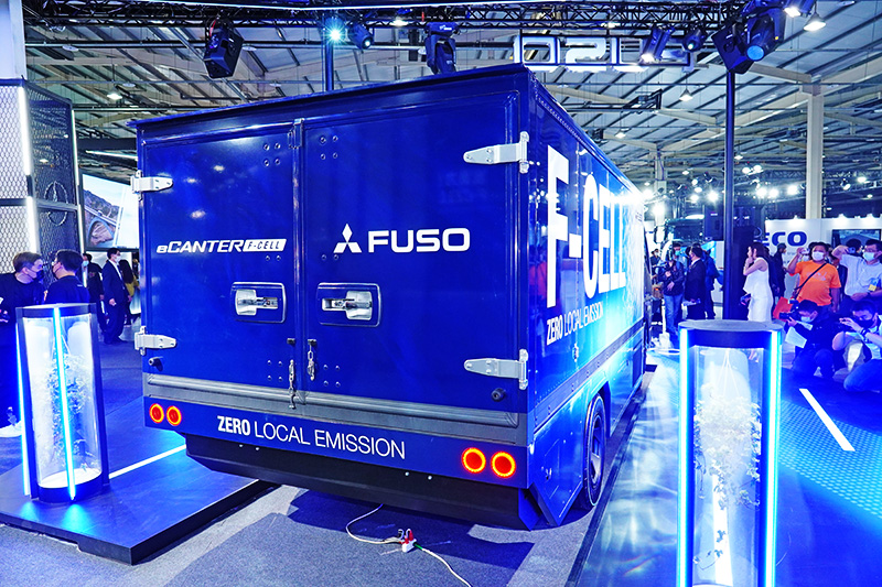 Fuso eCanter F-CELL為氫燃料商用概念車,雖說是概念車,實際上它可在道路運轉了,其設計總重為7.5噸,馬力輸出135kW。它的優點是兼具電動車的零污染及柴油車的便利性,一般電動車充電快則1.5小時,長約11小時, 而eCanter F-CELL充氫氣僅需要10分鐘,續航里程數即可達300公里,而且其載貨能力與柴油車相當,不僅完全達到二氧化碳零排放,唯一產生的廢料僅為水而已。因應全球暖化加劇及民眾環保意識抬升,聯合國要求2050年全面實施二氧化碳零排放,汽車製造廠責無旁賃共創零污染的未來,在此全球趨勢前提下,Fuso表示,總部未來將專注於純電及氫燃料兩大科技發展,純電車適合市區短途運輸,而氫燃料車適合跨區長途運輸,計劃於2050年將零排放車輛全面上路,深信兩大科技結合將會為地球生態圈及客戶創造最佳的經濟方案。