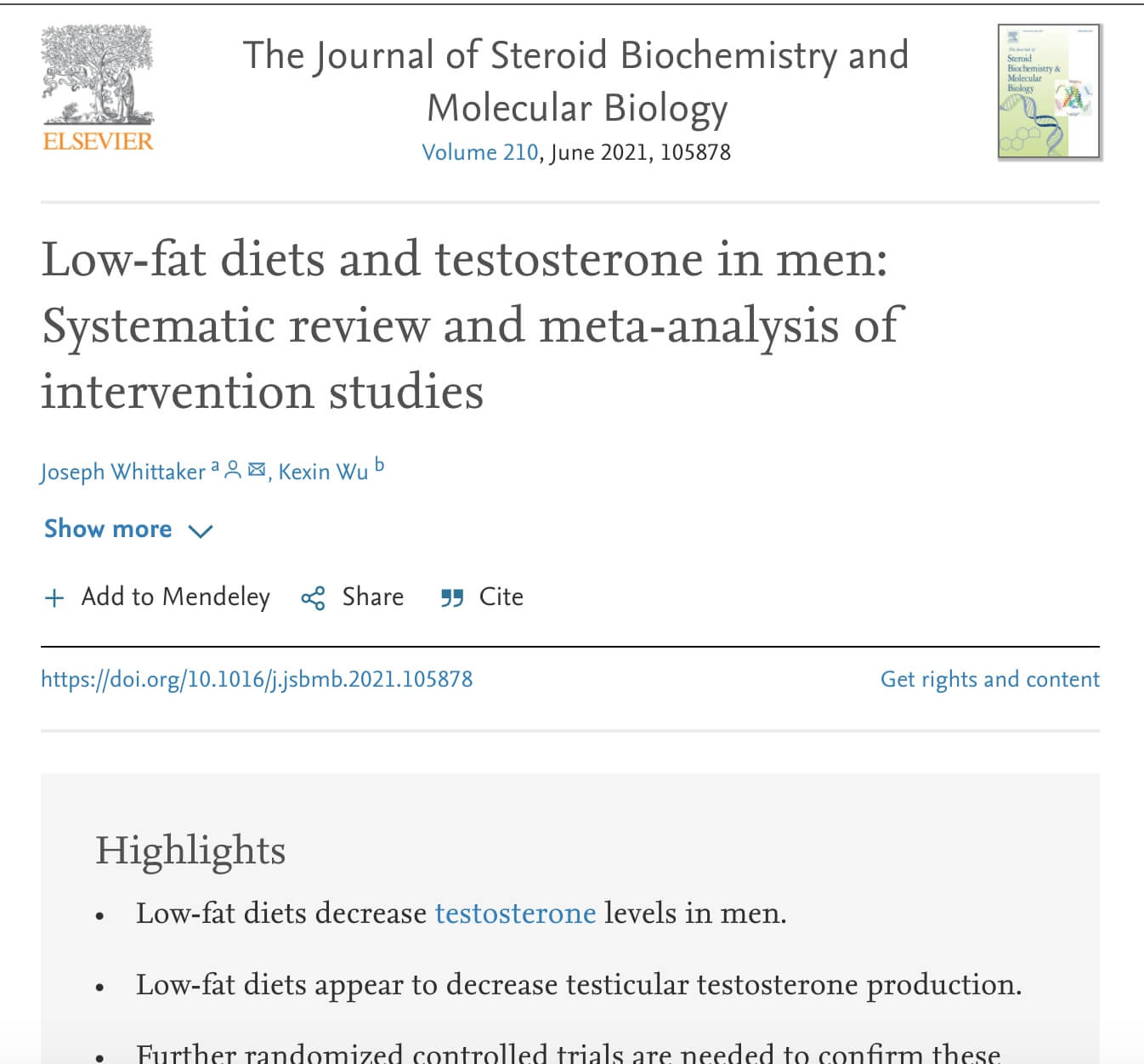 從先前的出6項研究進行回顧,研究團隊對206名參與者進行統合分析,發現當男性進行高脂肪飲食後,然後轉至低脂肪飲食,他們的睪固酮平均降低了10-15%,素食者更嚴重睪固酮減少高達26%,研究結果也刊登在國際期刊《 The Journal of Steroid Biochemistry and Molecular Biology》。