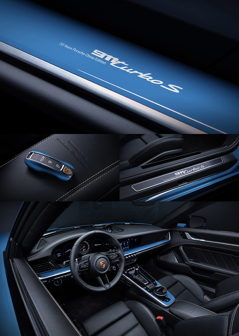 而每輛911 Turbo S China 20th Anniversary Edition都將搭配由Porsche Exclusive Manufaktur訂製部門精心設計的上白金色彩繪,除了貫穿全車中央的賽車線條,車側則有〝20〞數字與〝PORSCHE〞字樣,兩側 B 柱上也會有“20 Years Porsche China Edition”銀色徽章,車內則會搭上與車身同色飾板,並且在手套箱上緣、中央鞍座扶手與專屬車側門檻上,同樣也都會有20 Years Porsche China Edition”字樣,以示身分。