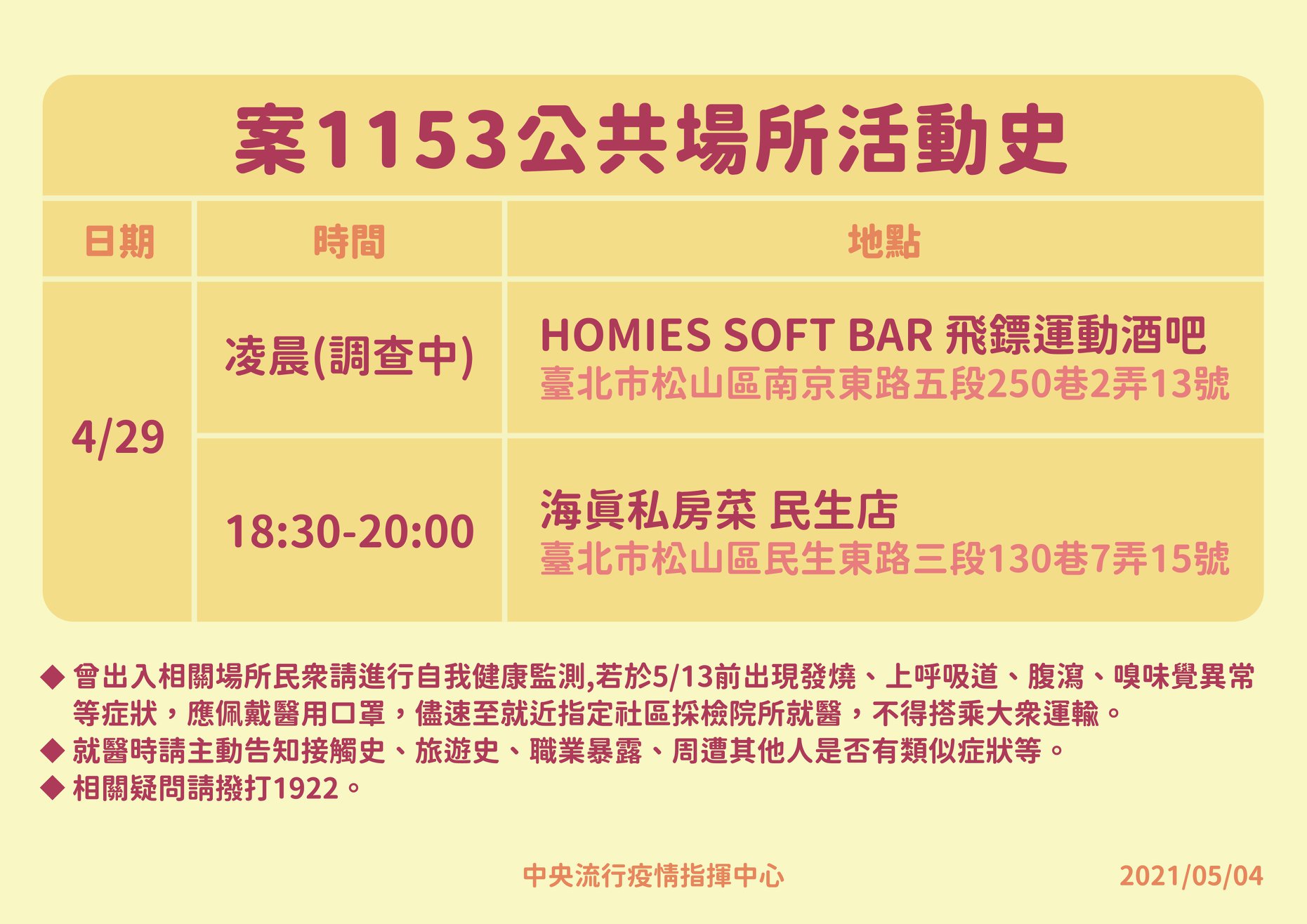案1153不確定是於本土感染或於境外,感染源待釐清。已初步掌握個案接觸者15人,其中13人列居家隔離,2人列自我健康監測。疫調後公告其可傳染期間活動史(詳見附圖),4月29日凌晨曾與案1154共同前往松山區HOMIES SOFT BAR飛鏢運動酒吧,18:00-20:00海真私房菜民生店用餐,提醒相關民眾進行14天自我檢康監測。