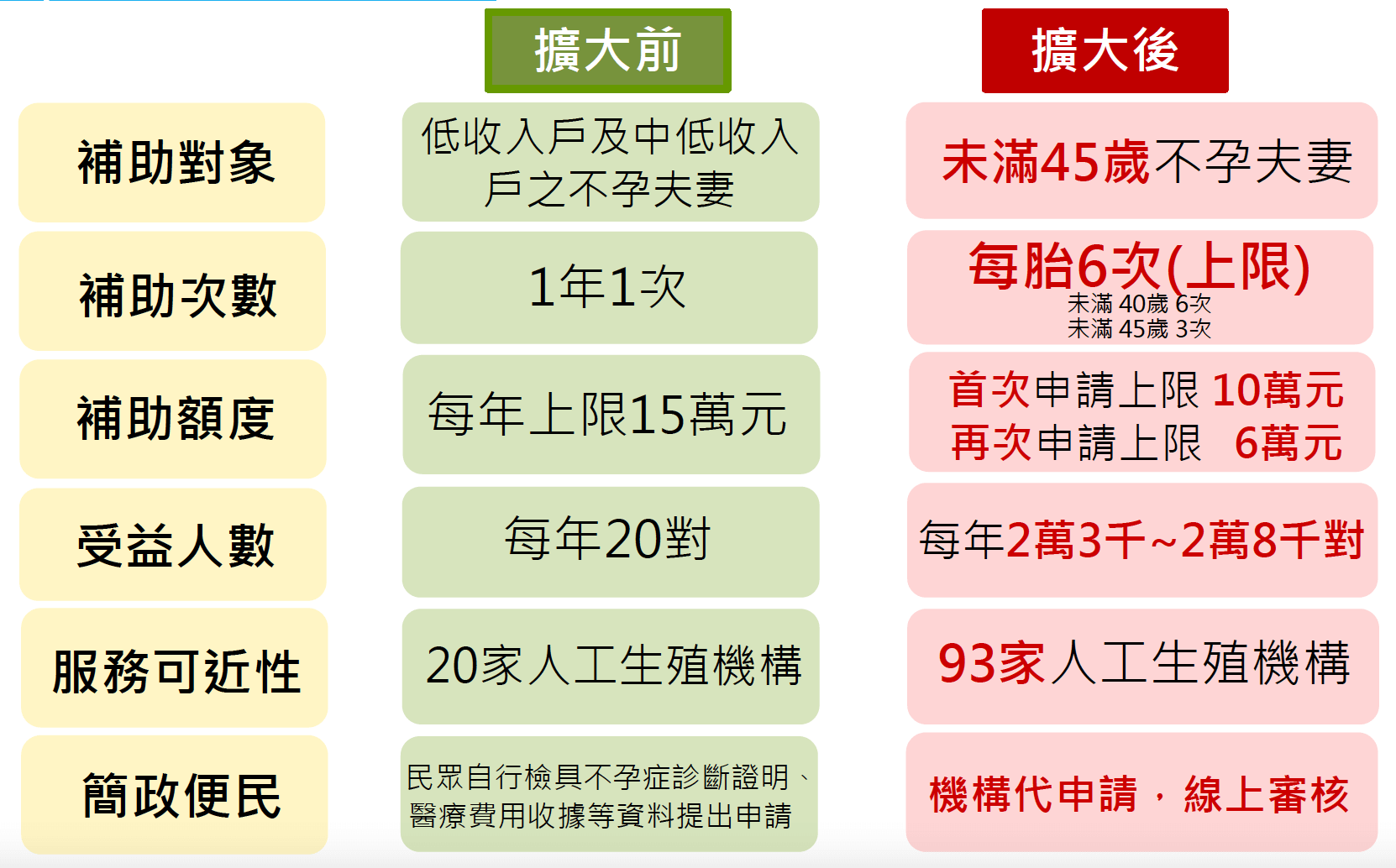 為滿足不孕夫妻生育期待,降低接受人工生殖療程費用的經濟壓力,原本只補助中低收入戶、低收入戶的不孕症試管嬰兒,擴大對象為一般不孕夫妻。只要至少一方具我國國籍,且妻子年齡未滿 45 歲,就可以進行申請。