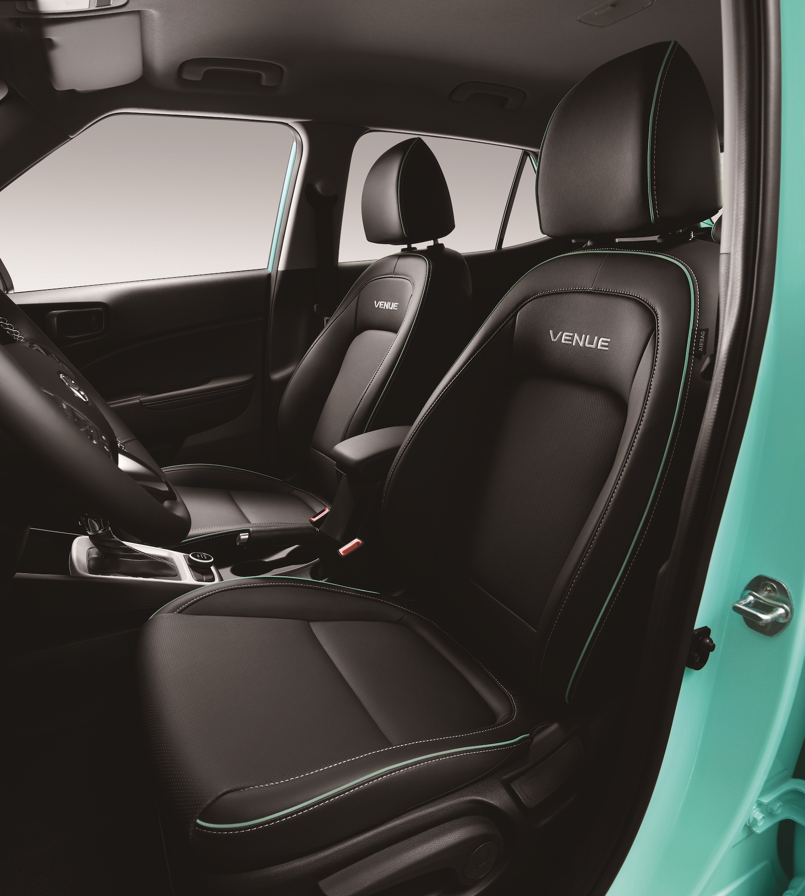此次 Venue 超顯色限定版再次發揮高 C/P 值特色,不僅針對外觀超顯新車色導入「堤芬妮 · 藍」或「珍妮佛 · 黃」的高質感專屬塗裝,更針對座艙內座椅皮革滾邊處理與車身同色對應。