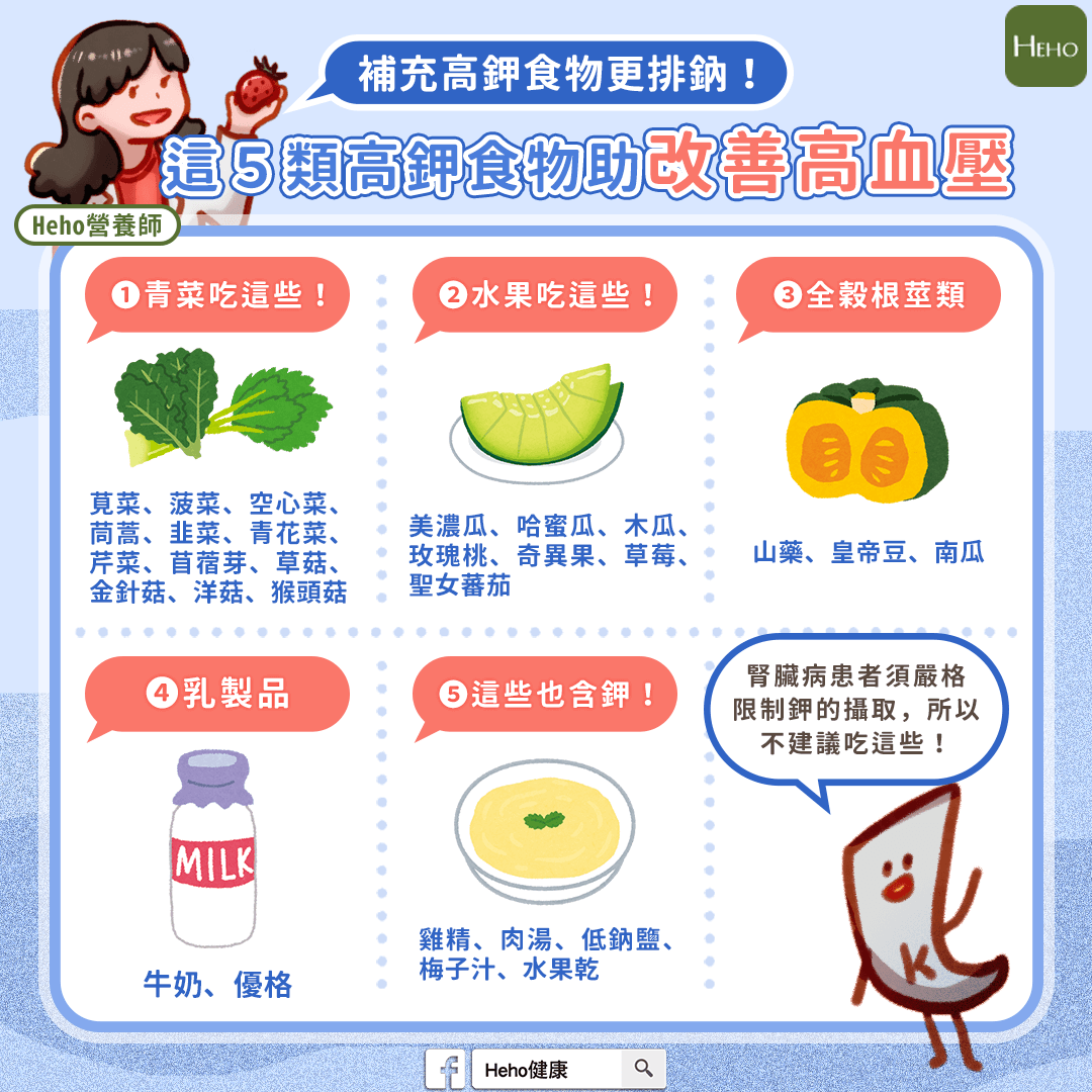 一般人腎臟功能正常者,多攝取來自食物中的「鉀離子」,鉀的最低需求量約為一天 2000毫克,當攝取量達到 4700 毫克時有助於改善高血壓;但要特別注意的是,腎臟病患者因無法透過腎臟排除鉀離子,必須嚴格限制鉀的攝取,所以不建議食用以下高鉀食物(每份 > 300 mg)