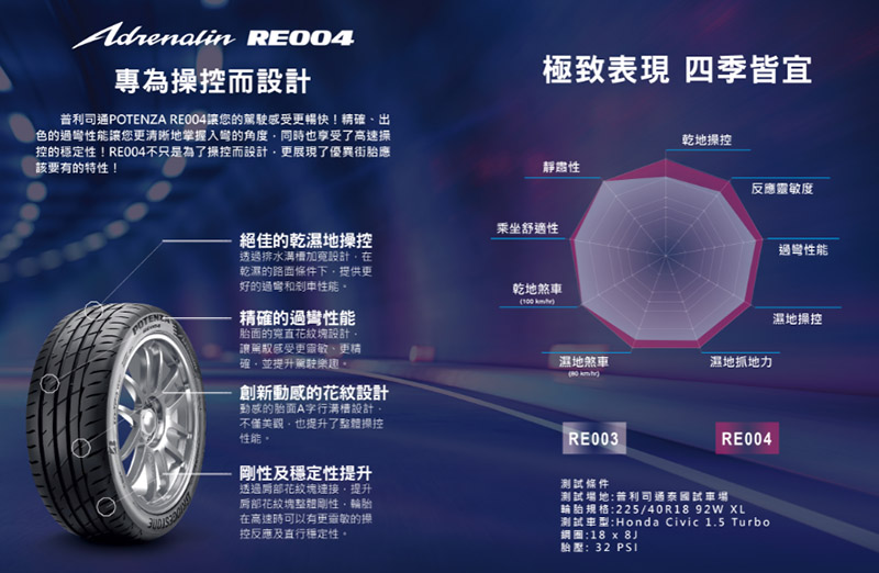 Potenza Adrenalin RE00X系列自問世以來,就已良好的全方位表現,深受好評,而本次測試的全新Potenza Adrenalin RE004,導入全新的複合材料創新技術,將二氧化矽膠料均勻分布於輪胎中,可大幅改善輪胎在溼地的煞車和操控性能,更可降低滾動阻力,減少車輛的環境足跡。此外,肩部花紋塊的剛性提升,也可讓駕駛在高速行駛時,同時兼顧靈敏的過彎反應,以及直行的穩定性。搭配創新動感的A字行溝槽花紋設計,有助提升整體操控性能。