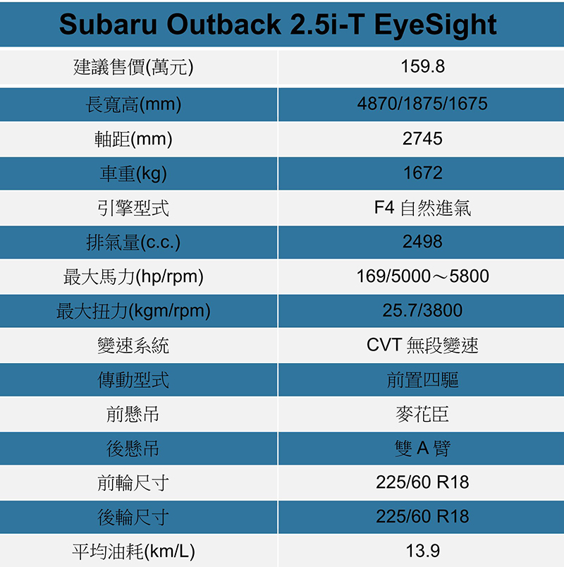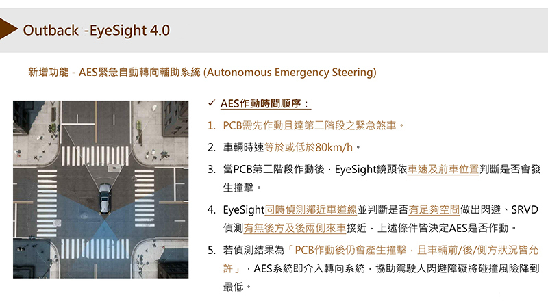 懸吊系統訴求舒適,因此面對不平路面相當有一套。 Outback另一讓人讚賞的就是EyeSight 4.0,不僅作動更快速細膩,在原本ACC主動車距定速巡航、PCB 預防碰撞自動煞車、LDW 車道偏離警示、LVSA 前車駛離警示外,亦新增EyeSight 4.0 還進一步追加 LCF車道維持置中、LDP車道偏離輔助、AES緊急自動轉向輔助等功能。另外先前配置於Forester的DMS智能駕駛警示系統新世代Outback也有所搭載,除具有疲勞駕駛偵測功能外,只要事先辨識設定,日後上車確認身分還會回復座椅角度、空調、資訊顯示幕。