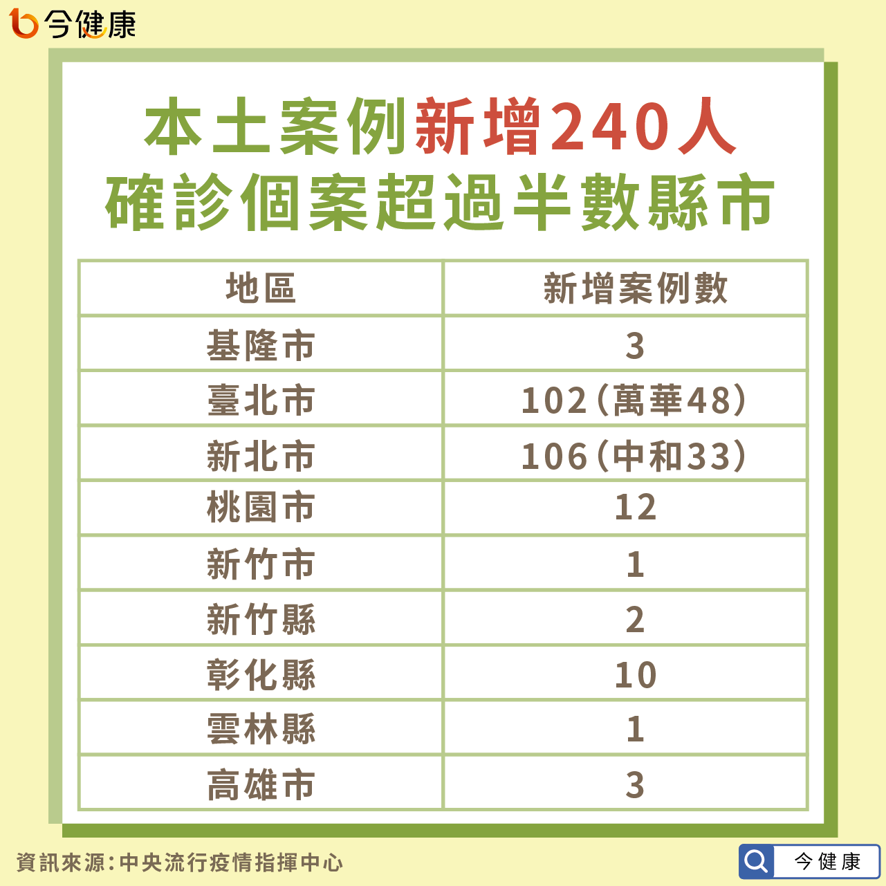 新冠肺炎本土病例人數連續4天突破單日百人,中央流行疫情指揮中心今(18)日公佈,新增240起COVID-19確診各案。包括新北市106例,以中和區33例最多。台北市102例,以萬華區48例最多。其他縣市部份為桃園市12例,彰化縣10例,基隆市與高雄市3例,新竹縣2例,新竹市及雲林線各1例。