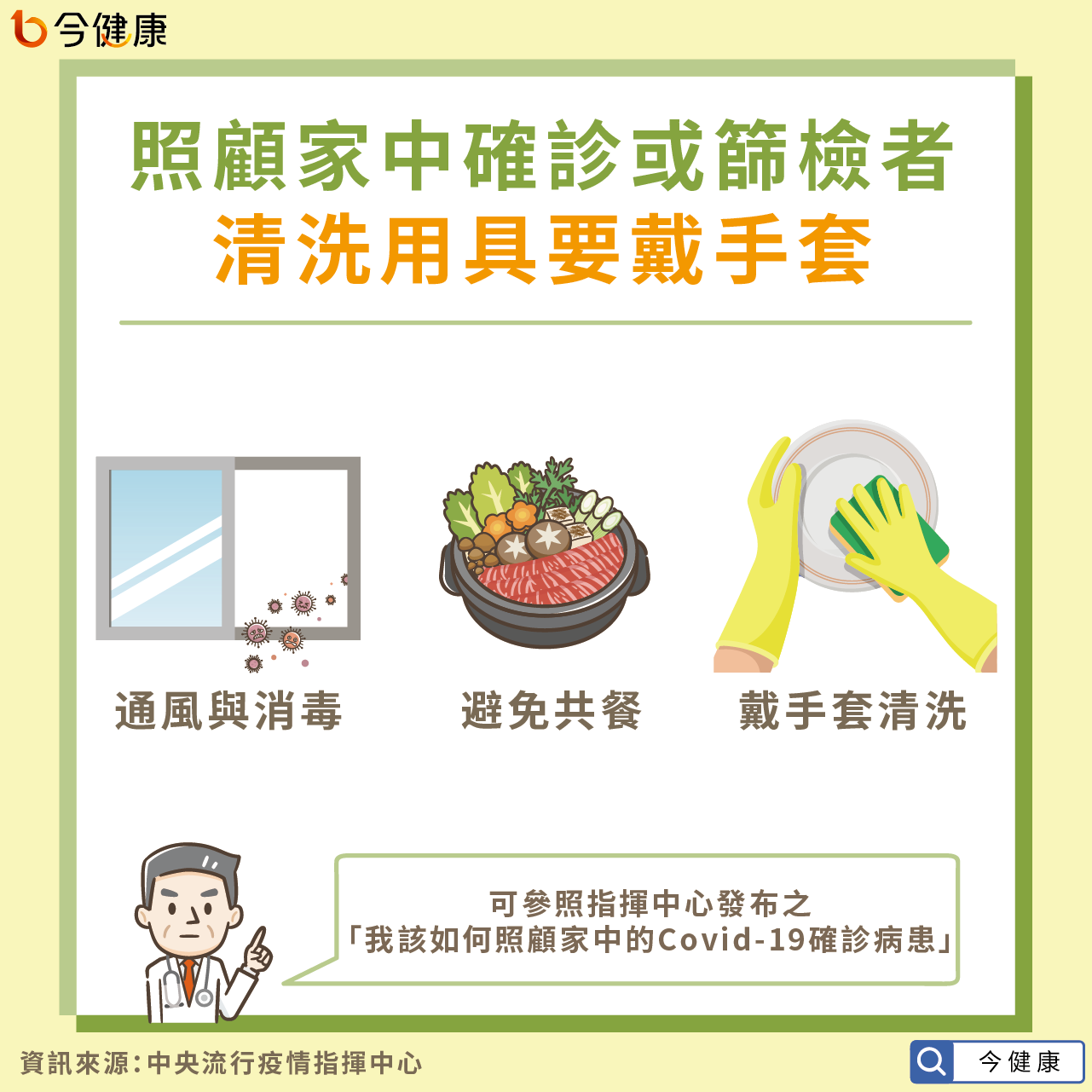 莊人祥提醒,65歲以上、有免疫低下或潛在疾病者,為感染重症高風險族群,不可直接照顧確診個案。健康照顧者在照顧家中個案時,如要共用浴廁務必做好通風與消毒,也要避免共餐與共用物品。