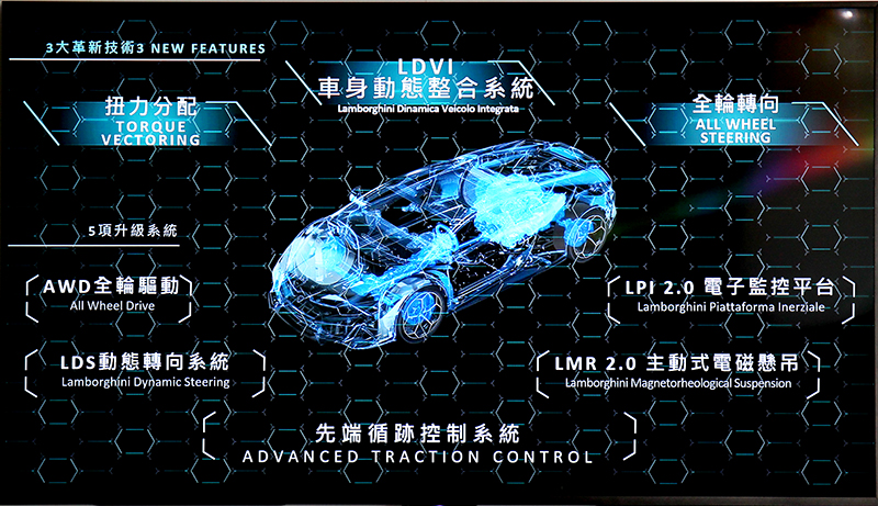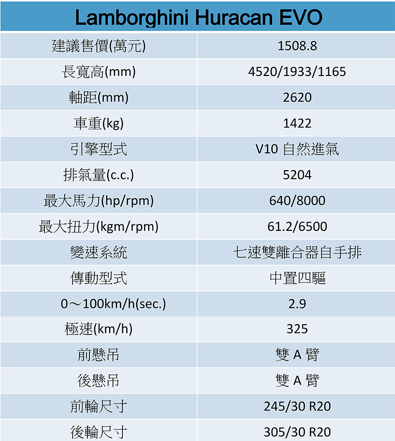Huracán EVO所搭載的動力系統幾乎市面上碩果僅存的5.2升V10自然進氣引擎,並且依據傳統在後方嵌有引擎點火順序的銘牌。 至於在動能與操控表現部分,首先,Huracán EVO仍搭載目前可說是市場上碩果僅存的5.2升V10自然進氣引擎,在經過升級後,動力輸出就與小改前的Huracan Coupe Performante相同,具備640hp最大馬力及600Nm最大扭力,原廠公布的0-100km/h加速成績為2.9秒,極速則為325km/h,然而Huracán EVO操控性升級上,是導入了後輪轉向與扭力分配系統,並由全新LDVI(Lamborghini DinamicaVeicoloIntegrata)車身動態整合系統所管理,簡單說就是電控系統變得更加強大,透過更多的感知器偵測車輛動態,調節車輛的各系統參數,提前預判駕駛者行為,提供車輛更適切的動力輸出、電子懸吊回饋反應等,讓整輛車的Huracán EVO駕馭感提升。