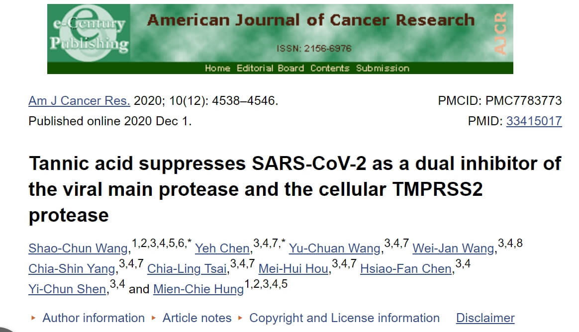 2020 年發表於《美國癌症研究雜誌 (American Journal of Cancer Research)》,由中央研究院院士、中國醫藥大學校長洪明奇帶領的團隊首次發現單寧酸會雙重抑制新冠病毒進入體內的關鍵蛋白酶和跨膜蛋白酶絲氨酸 2,能有助於抑制病毒活性。消息一出,大家開始想補充富含單寧酸的食物。