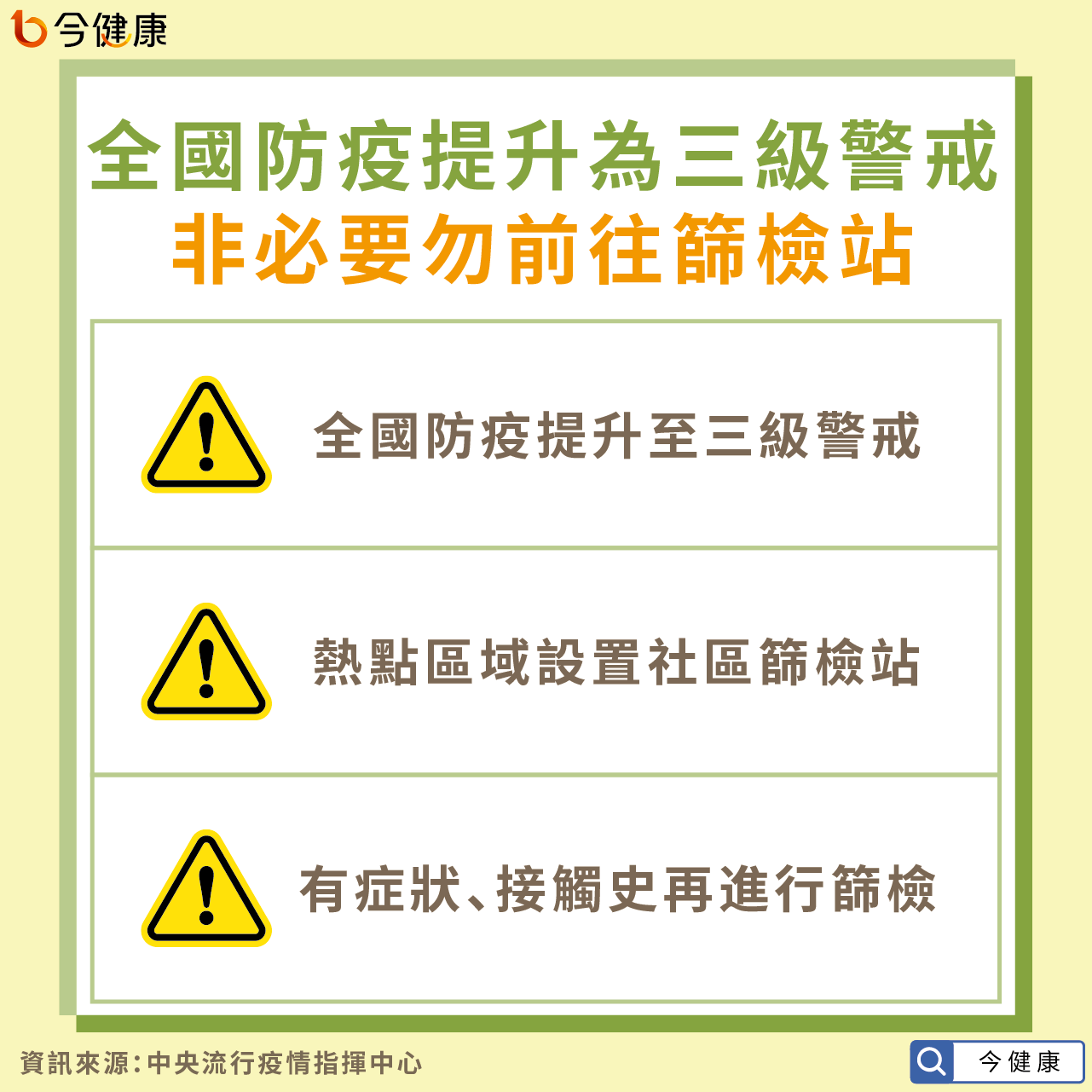 陳時中也表示,全國同步提升三級警戒,各地方將進行篩檢站的設置工作,在收集各縣市確診患者的足跡之後,運用資訊系統整合出該縣市感染風險的熱點區域。熱點區域可能表示有潛在感染源,或是較多確診者活動的傳播風險。找出熱點後將增設社區篩檢站。