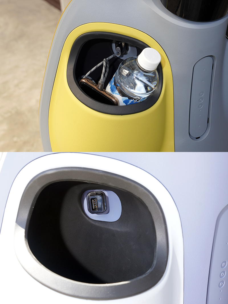 至於其他便利性設計車廂擁有 23.9 公升置物空間,能輕易置放一頂3/4 罩標準安全帽和一頂1/2罩標準安全帽,本次試騎、較高階的Viva MIX Belt車款配有置杯架,並且在側邊設有USB插座,便於放置飲料與為手機充電,但單一杯架設計,同時放手機與600c.c.還勉強可行,若容量較大的瓶裝或罐裝飲料,為手機充電的空間可能就會有些不足了,而且Viva MIX車系中僅有Belt車型有杯架與USB插座,就其他因高低階車型而差異之配備與配置成本來看,這兩項應該算是相對低的,而且是相對實用性最高的,卻只有給高階車型配置,這邏輯有點讓人不太懂。