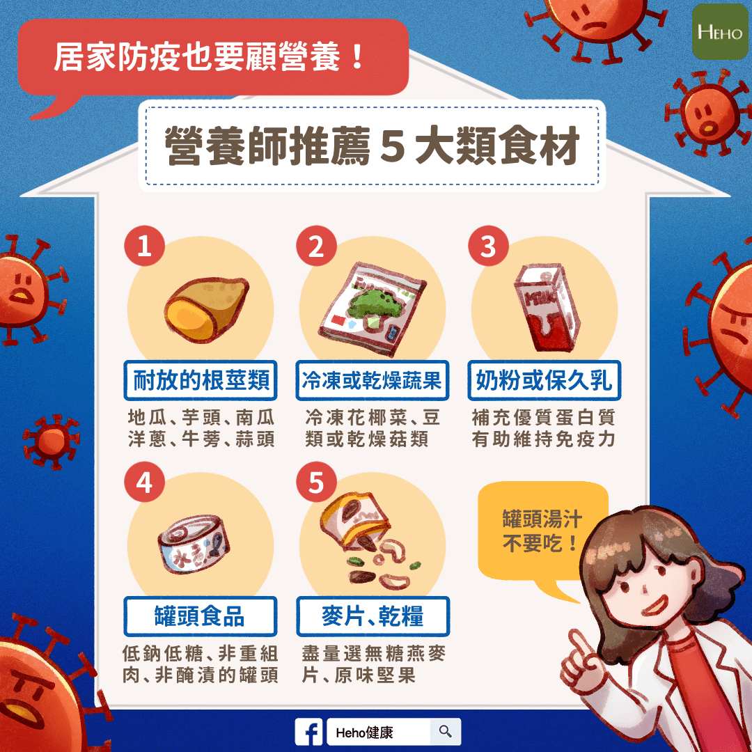想要防疫躲在家一兩週不出門,準備去超市囤貨卻不知道要買甚麼嗎?以下主要建議保鮮期較長且能夠營養搭配的食材: