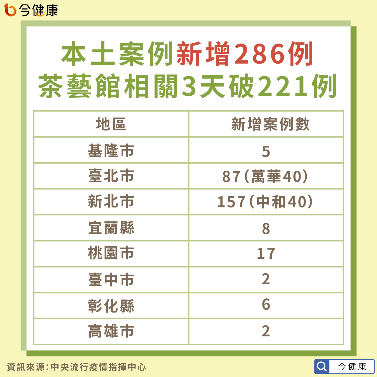 新冠肺炎本土個案已連續6天超過百例,中央流行疫情指揮中心指出,今(20)日本土COVID-19確診個案增加286人,其中,新北市157例以中和區40例最多,臺北市87例以萬華區40例最多。桃園市17例、宜蘭縣8例,彰化縣6例,基隆市5例,高雄市及臺中市各2例。