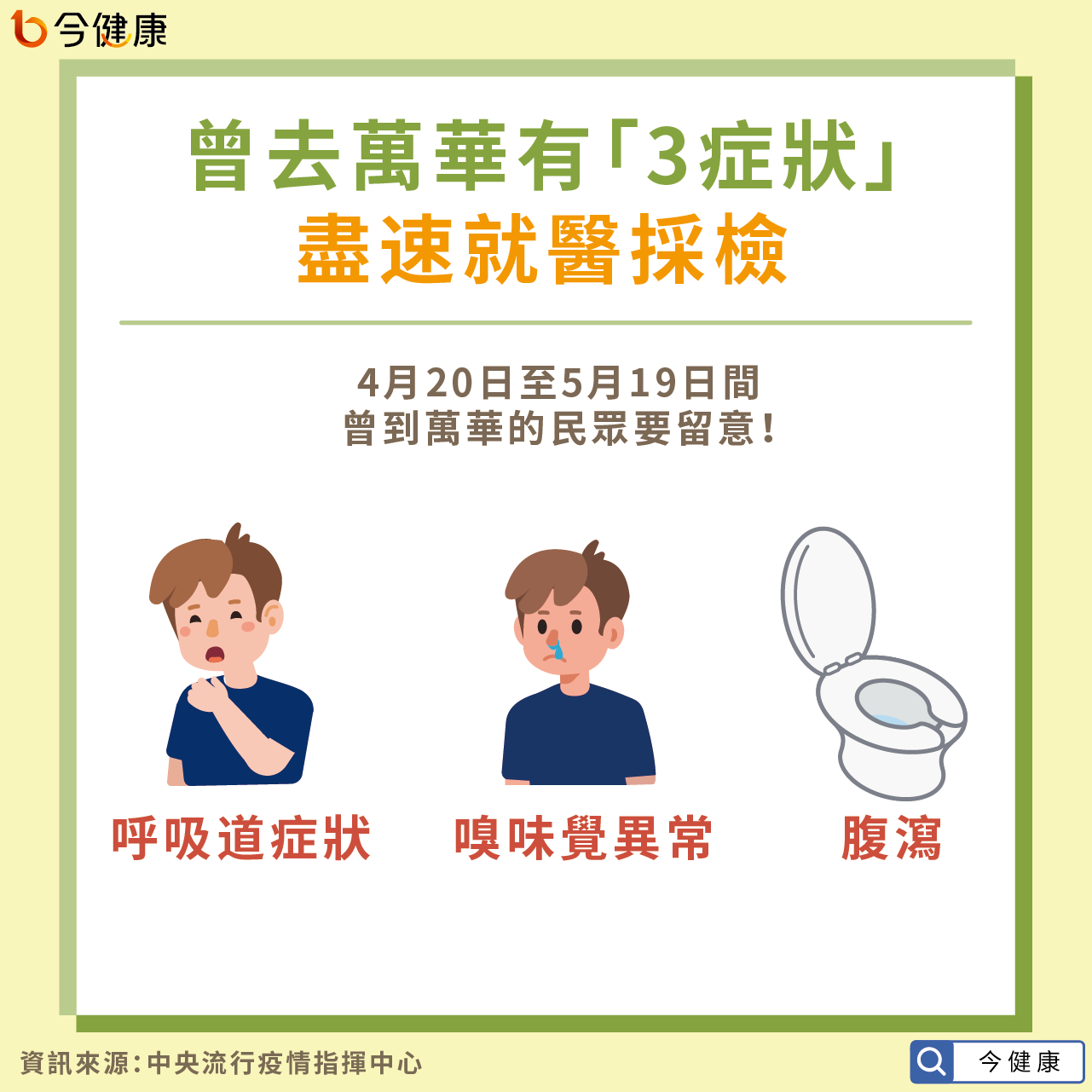 由於臺北市萬華地區確診人數激增,指揮中心宣佈今日(20)下午15時開始,將針對4 月20日至5月19之間,曾於萬華地區有停留活動史的外縣市民眾發出提醒簡訊,若這段期間內發生呼吸道症狀、腹瀉、嗅味覺異常,應盡速聯繫當地衛生局並就醫採檢。
