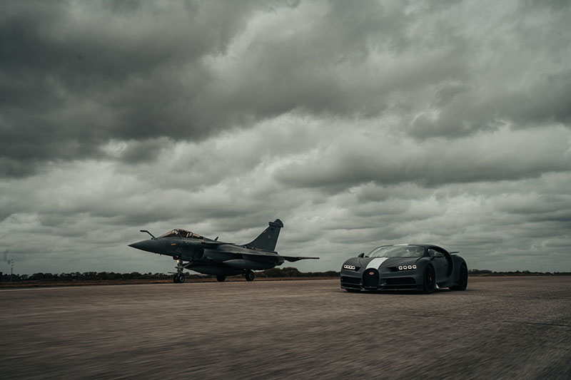 2007年著名的英國汽車電視節目【Top Gear】,曾經拍攝由主持人Richard Hammond駕駛Bugatti Veyron,對上歐洲颱風戰機進行了場加速折返賽,而這回則是由Bugatti官方與法國海軍合作,由專屬試車手Pierre-Henri Raphanel駕駛全球限量20台的Chiron Sport LesLégendesdu Ciel,在法國西北部Landivisiau的海軍基地,對上了Etienne上尉駕駛的海軍版飆風戰機,搭載8.0升W16引擎的Chiron Sport有1500PS/1600Nm之最大動力,而海軍版飆風戰機,搭載2台Snecma M88-4e 渦輪風扇發動機,每一具在點燃後燃氣下,可輸出58,550 Nm 〈5,727 PS〉的推力。