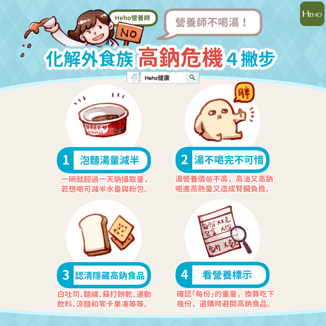 泡麵的鈉含量非常高,有的吃下一碗就超過整天的建議量,如果你每次都把整個調味包加完,覺得這樣的鹹度才對味的話,建議先把加水量減半,讓湯少一點,這樣加半包就可以有一樣的鹹度,吃下的總鈉量比較少,又不會覺得口味太淡。