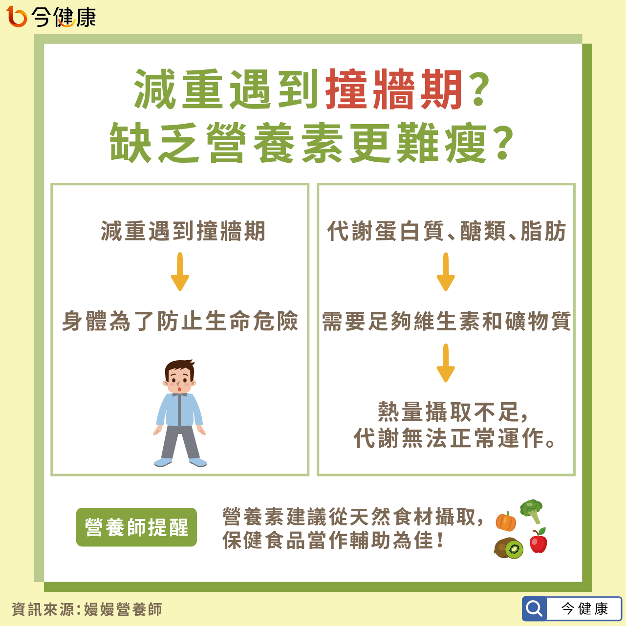 嫚嫚營養師表示,所謂「撞牆期」是指體重降到一定程度,身體防禦機制將愈來愈強,為了防止生命危險,體重會維持一定水準,無法再下降。另一方面,身體代謝蛋白質、醣類、脂肪,需要足夠的維生素和礦物質當作輔酶,能量代謝才會是正常,如果一天攝取少於1200大卡,所需的維生素和礦物質就會缺乏,導致身體機能無法正常運作,讓代謝更糟糕,因此一天熱量攝取需要大於1200大卡,營養素才有可能足夠。